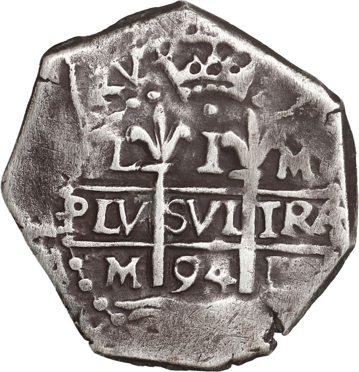 PERU, Lima, cob 1 real, 1694 M, ex-Ugaz. S-L11; KM-20; Cal-225. 3.22 grams. Broad, sharply seven-sided flan with choice full pillars featuring a complete crown at top, another complete crown above slightly off-center cross, king's name CAROLV(S) in legend, three assayers, contrastingly toned VF. Pedigreed to the Jorge Ugaz Collection.
