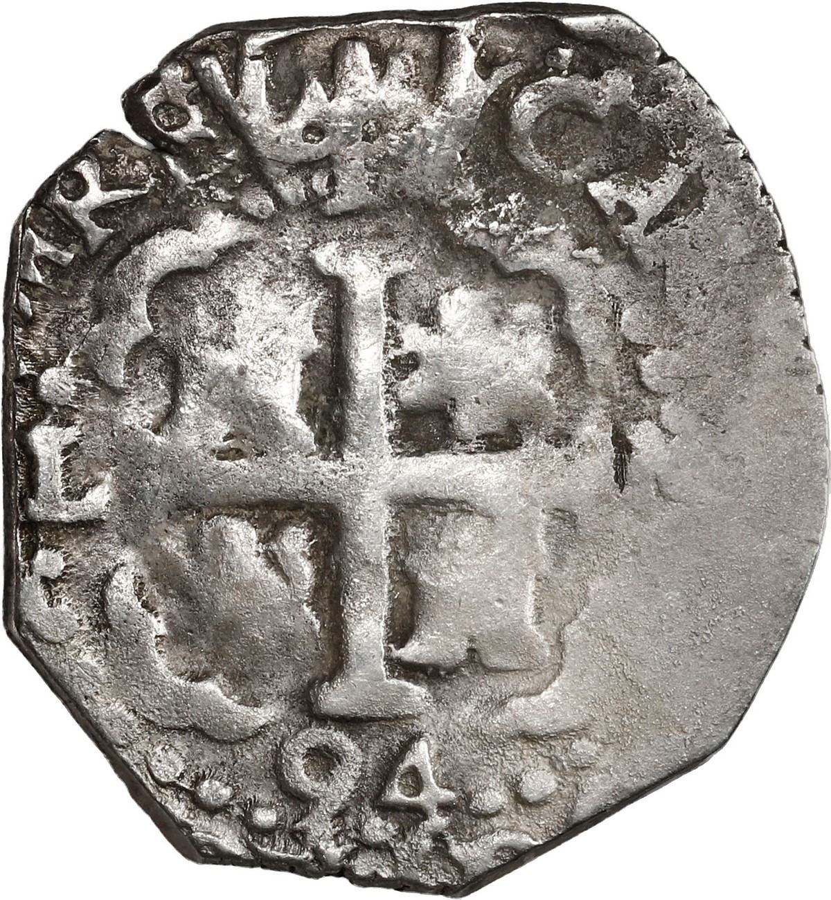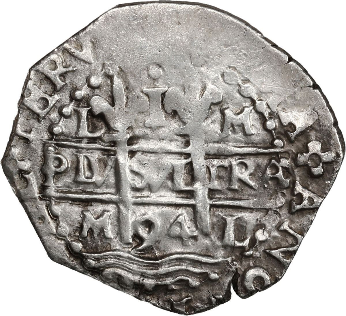 PERU, Lima, cob 1 real, 1694 M, ex-Ugaz. S-L11; KM-20; Cal-225. 2.91 grams. Nice, broad XF with full pillars and two dates, weak yet full cross with partial king's name, some mild surface corrosion. Pedigreed to the Jorge Ugaz Collection.
