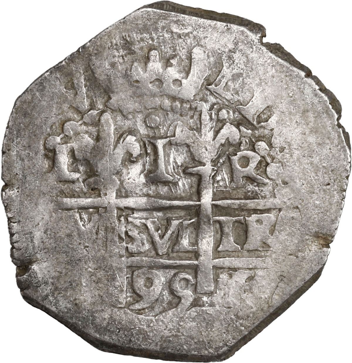 PERU, Lima, cob 1 real, 1695 R, ex-Ugaz. S-L12; KM-20; Cal-226. 3.66 grams. Well-struck XF with full pillars and cross plus two clear dates, nice surfaces with light golden toning. Pedigreed to the Jorge Ugaz Collection.