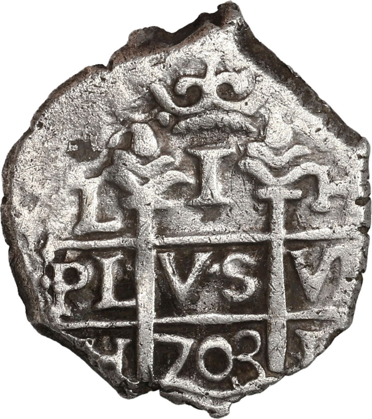 PERU, Lima, cob 1 real, 1703 H, ex-Ugaz. S-L15a; KM-31; Cal-380. 3.01 grams. Compact flan with choice full pillars and cross, two dates and mintmarks and assayers, lightly toned XF. Pedigreed to the Jorge Ugaz Collection.
