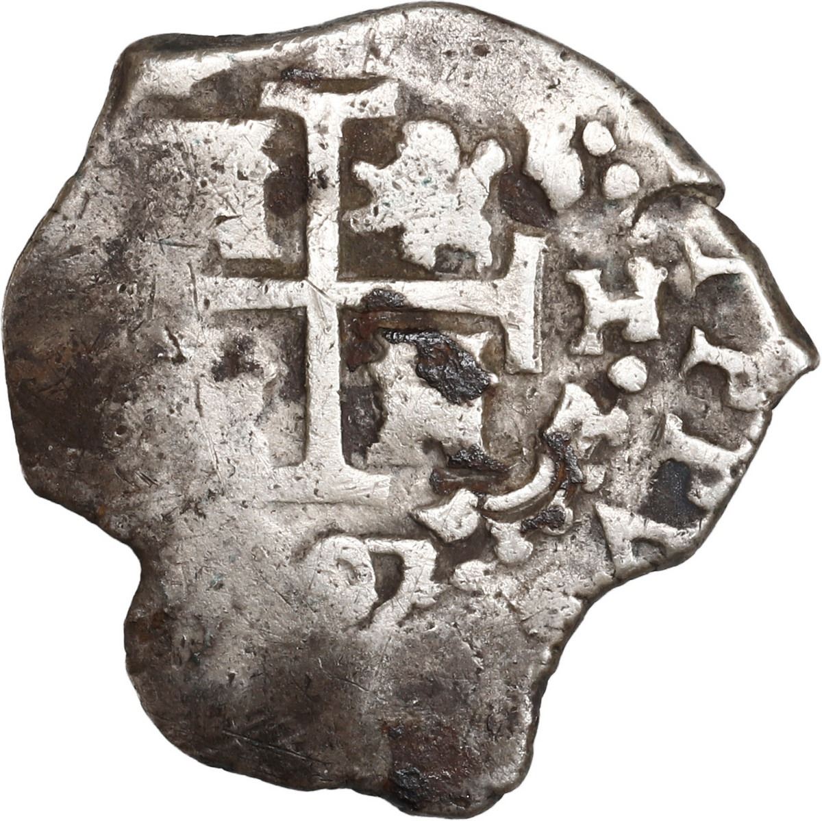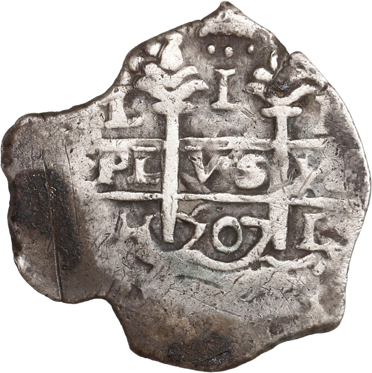 PERU, Lima, cob 1 real, 1707 H, ex-Ugaz. S-L17; KM-31; Cal-385. 2.92 grams. Odd-shaped flan (broad) with full pillars, nearly full cross, two dates and mintmarks, all three assayers, VF with some toning but also small spots of dark "horn silver." Pedigreed to the Jorge Ugaz Collection.
