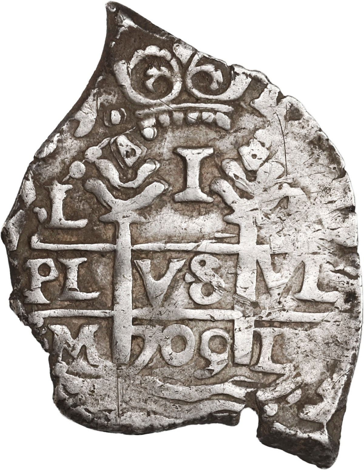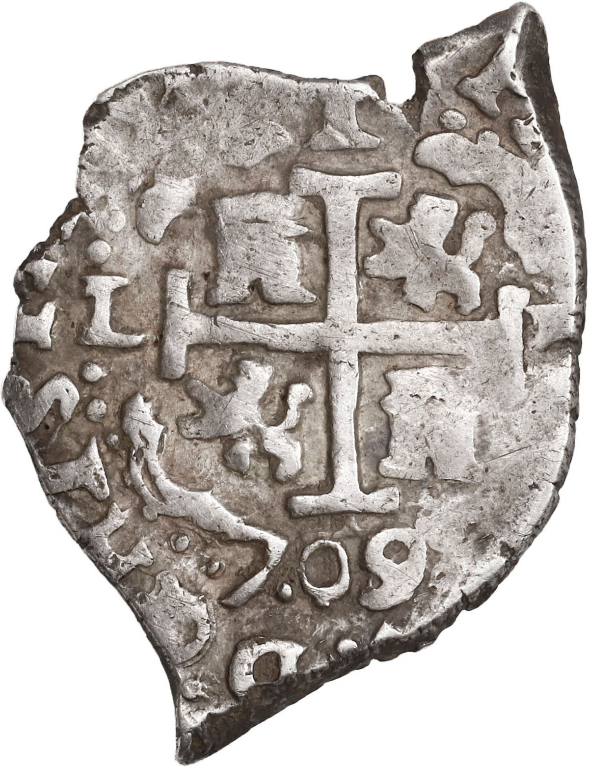PERU, Lima, cob 1 real, 1709 M, ex-Ugaz. S-L18; KM-31; Cal-387. 3.49 grams. Interesting shape (round with two sharp points), full pillars and cross, complete crown, two bold dates with bottom of 1709 in legend as well, three mintmarks, lightly toned VF. Pedigreed to the Jorge Ugaz Collection.