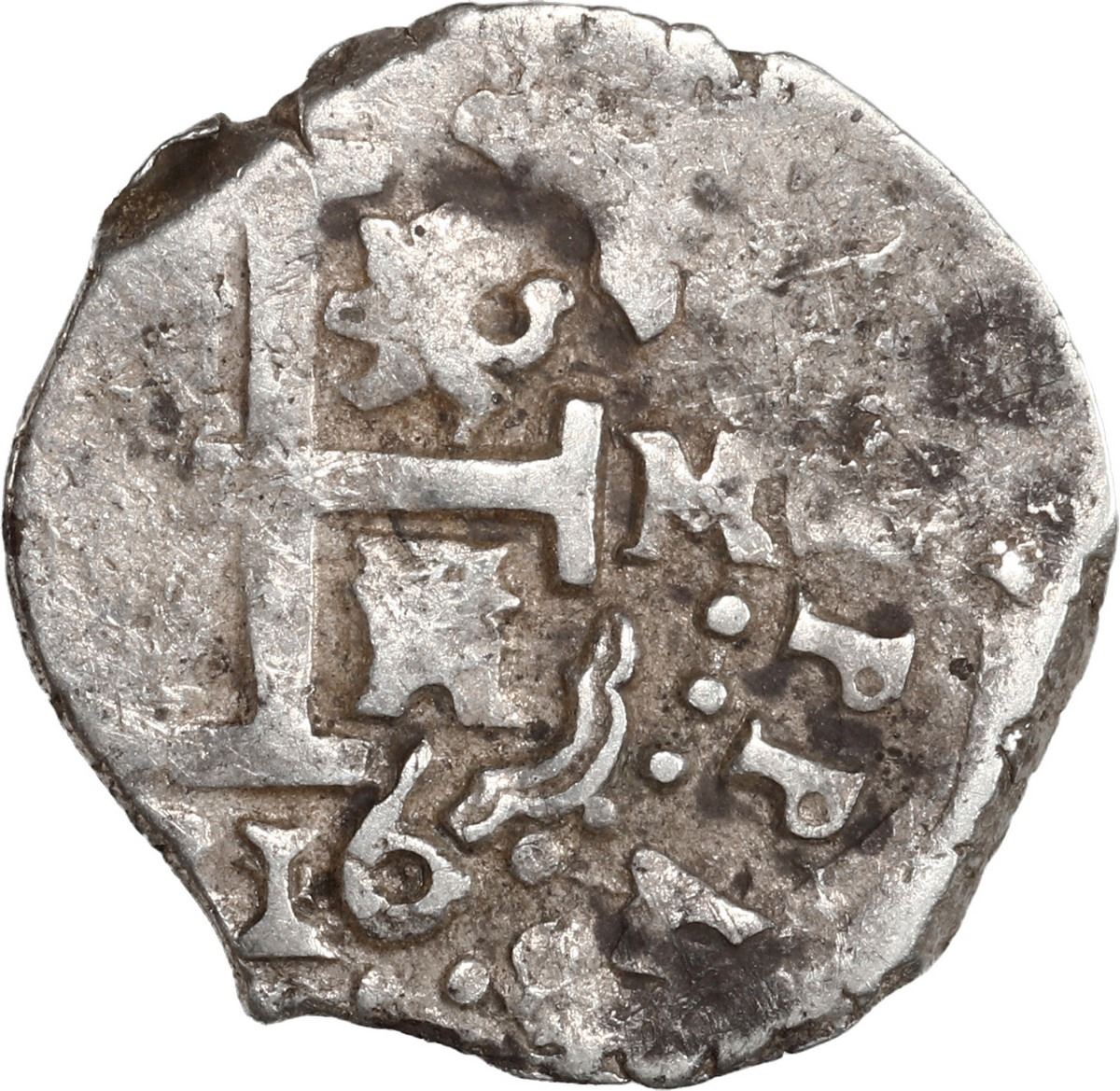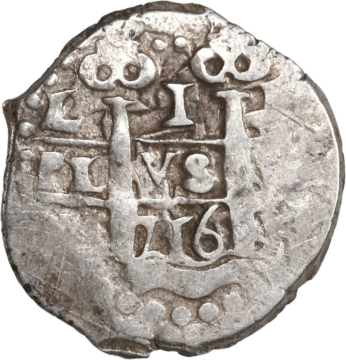 PERU, Lima, cob 1 real, 1716 M, ex-Ugaz. S-L20; KM-31; Cal-397. 3.38 grams. VF, struck a bit crudely but with two clear dates, off-center cross with part of king's name visible. Pedigreed to the Jorge Ugaz Collection.