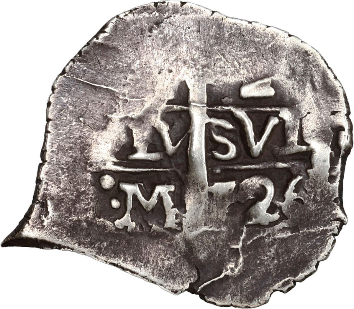 PERU, Lima, cob 1 real, 1726 M, ex-Ugaz. S-L20b; KM-31; Cal-407. 2.57 grams. Neat teardrop-shaped VF with irregular surfaces and sharp edges, bold partial pillars and cross with clear date and assayer, dark gray toning. Pedigreed to the Jorge Ugaz Collection.