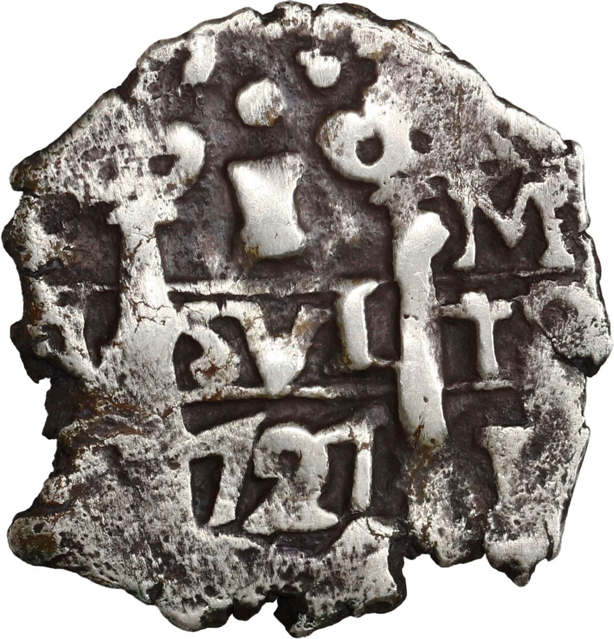 PERU, Lima, cob 1 real, 1727 M, ex-Ugaz. S-L20b; KM-31; Cal-408. 2.82 grams. Bold date and assayer within pillars, good full cross, nice but porous VF with slightly crude edge (as made), contrasting toning. Pedigreed to the Jorge Ugaz Collection.