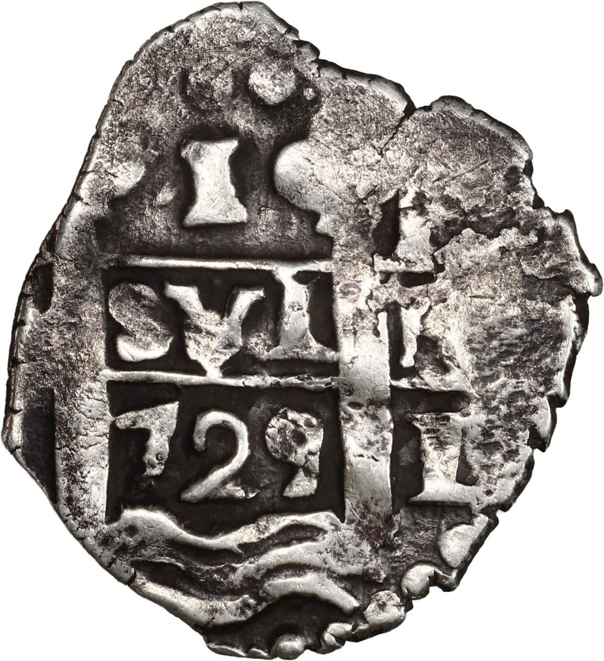 PERU, Lima, cob 1 real, 1729 N, ex-Ugaz. S-L21; KM-31; Cal-410. 2.94 grams. Bold date above full waves, good full cross, contrastingly toned VF. Pedigreed to the Jorge Ugaz Collection.