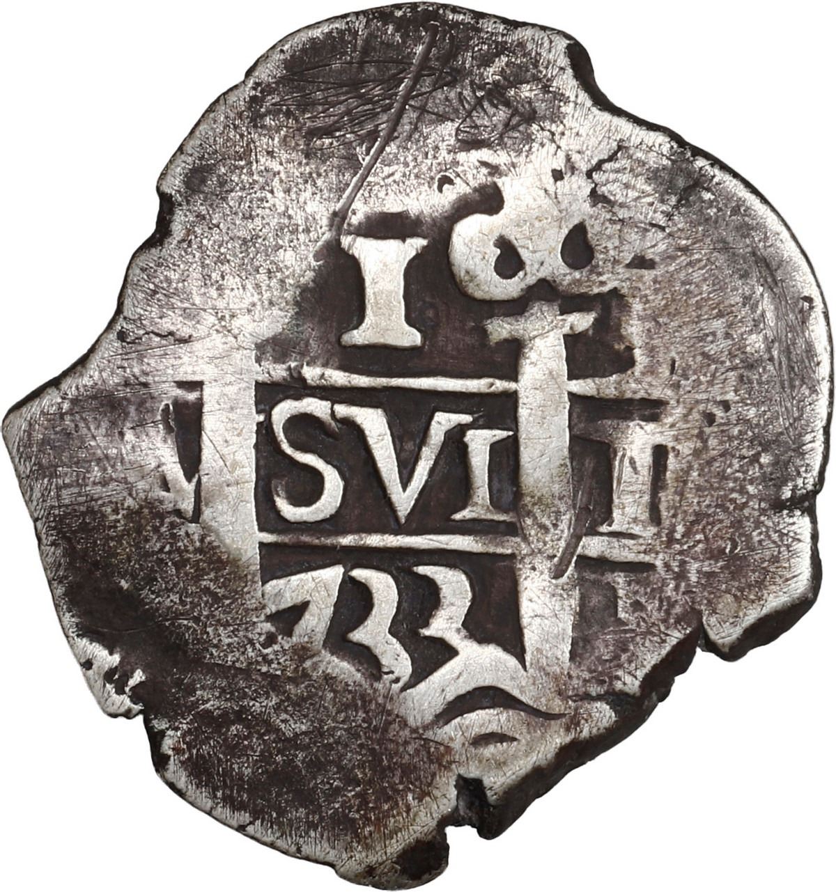 PERU, Lima, cob 1 real, 1733 N, ex-Ugaz. S-L21; KM-31a; Cal-414. 3.32 grams. VF with bold partial pillars and cross plus clear date, flat peripheries with dark toning and a few hairlines. Pedigreed to the Jorge Ugaz Collection.