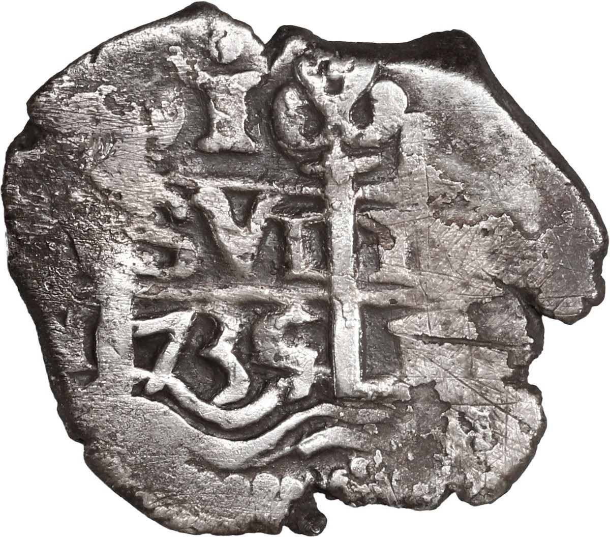 PERU, Lima, cob 1 real, 1735/4 N, unique(?), ex-Ugaz. S-L21; KM-unl (31 for type); Cal-unl (Type 70). 3.20 grams. Off-center cross, bold full waves and right-hand pillar with equally bold date exhibiting a very clear 5/4, a known overdate for ½, 4, and 8 reales but this is the first 1 real we have seen or heard of, unevenly toned VF with some peripheral flatness. Pedigreed to the Jorge Ugaz Collection.
