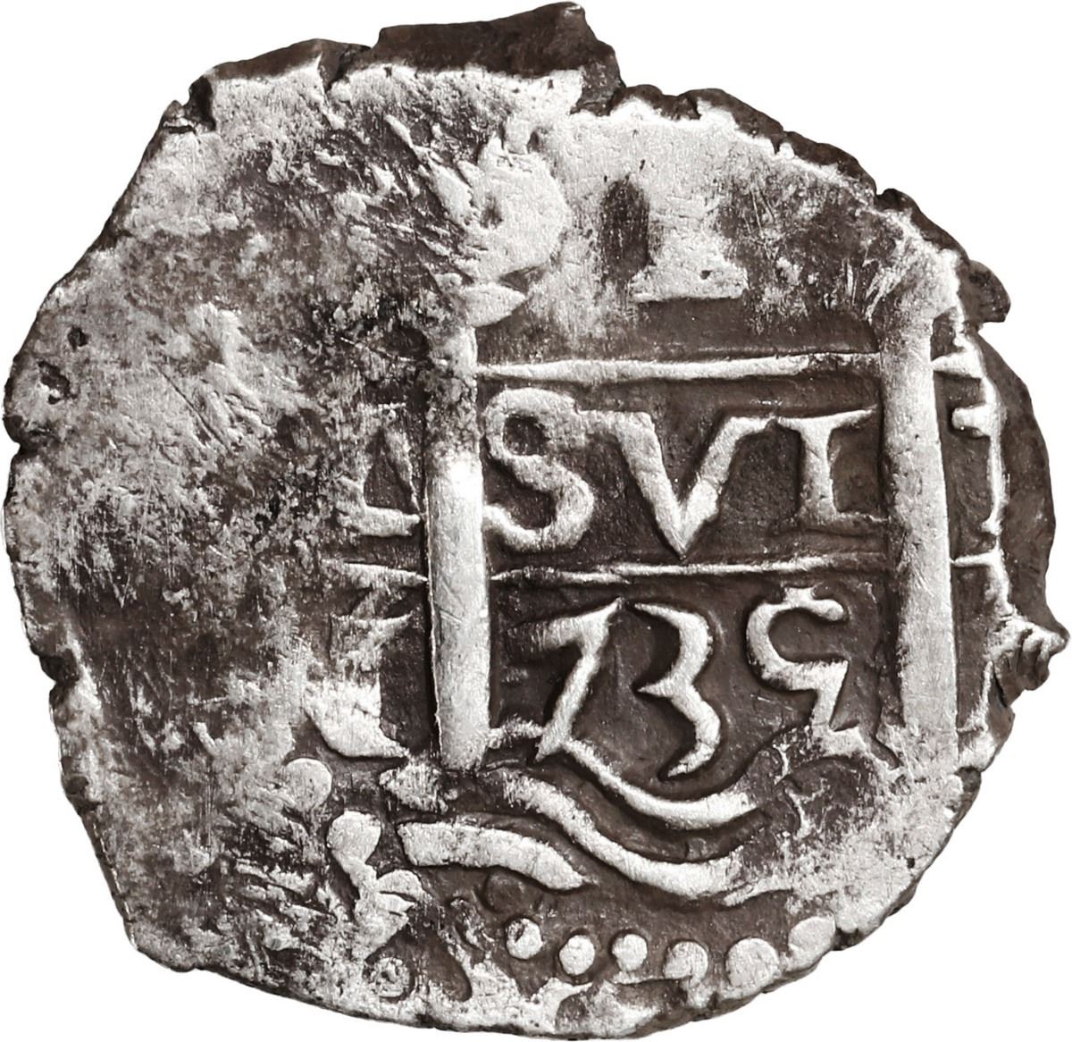 PERU, Lima, cob 1 real, 1735 N, ex-Ugaz. S-L21; KM-31a; Cal-416. 3.74 grams. VF with choice bold date between pillars, nearly complete cross with clear assayer, natural crude edges. Pedigreed to the Jorge Ugaz Collection.