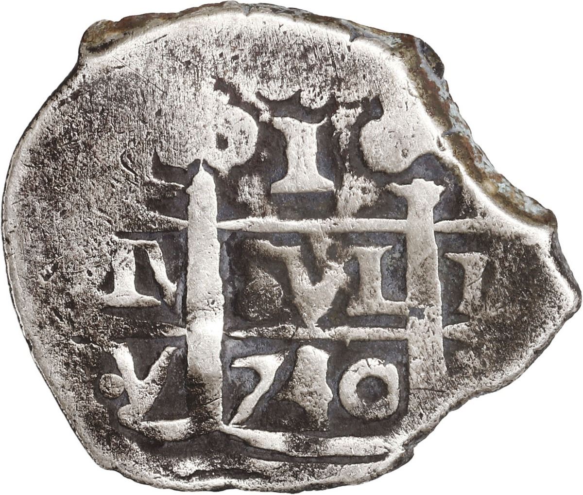 PERU, Lima, cob 1 real, 1740/39 V, very rare, ex-Ugaz. S-L22; KM-unl (31a for type); Cal-unl (Type 70). 3.70 grams. Good full cross and pillars, both with visible dates, the overdate detectable between the pillars with the 4 clearly thin as modified from a 3 and the 0 with straight right side as modified from a 9 (second example we have seen), full assayer, VF with contrasting toning. Pedigreed to the Jorge Ugaz Collection.
