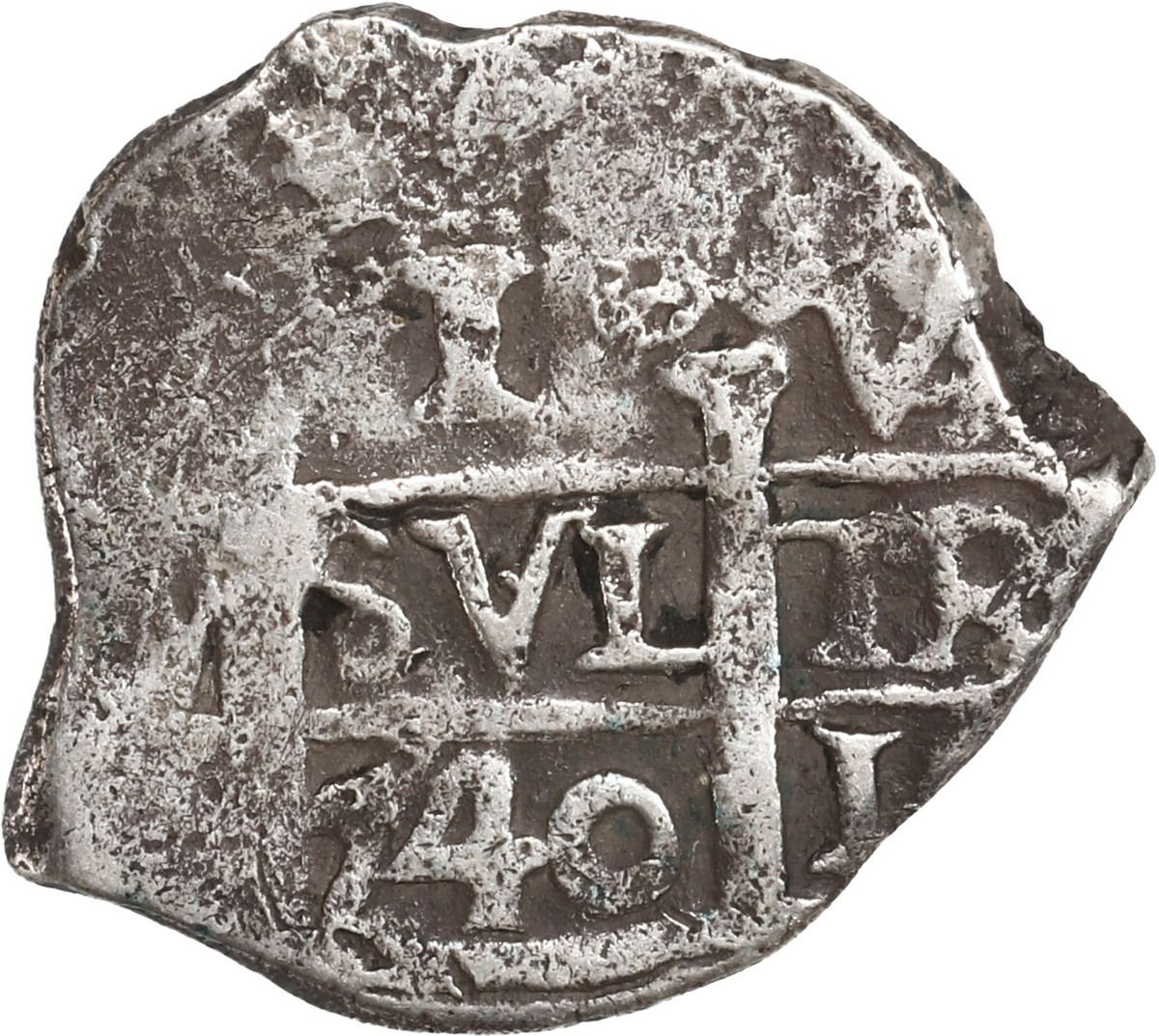 PERU, Lima, cob 1 real, 1740 V, ex-Ugaz. S-L22; KM-31a; Cal-422. 3.68 grams. AVF with crude, lightly corroded surfaces but showing off a bold date and assayer on the pillars side, partial cross with clear assayer at right. Pedigreed to the Jorge Ugaz Collection.