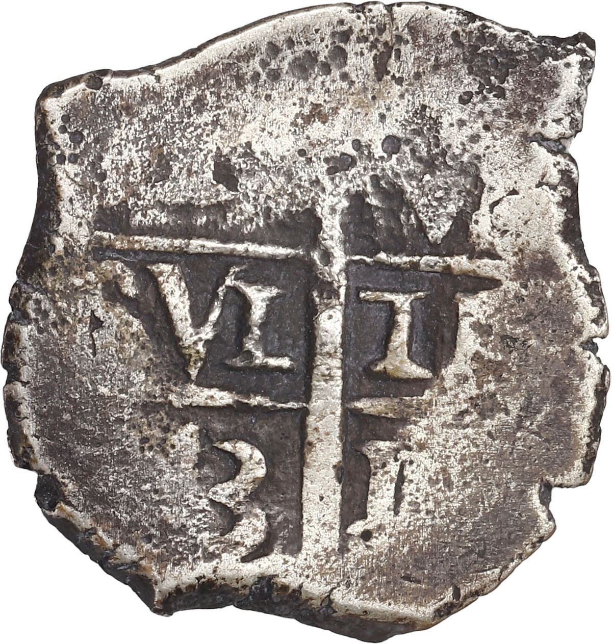 PERU, Lima, cob 1 real, 1743 V, ex-Ugaz. S-L22; KM-31a; Cal-425. 3.12 grams. AVF with darkly toned, lightly pitted surfaces though possessing clear final two digits of the date plus the assayer on the pillars side, decent cross detail. Pedigreed to the Jorge Ugaz Collection.