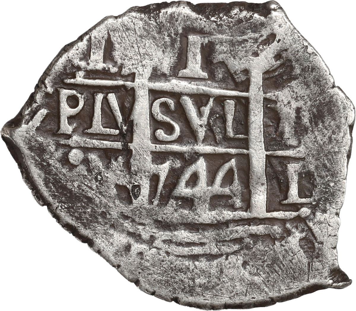 PERU, Lima, cob 1 real, 1744 V, ex-Ugaz. S-L22; KM-31a; Cal-426. 3.39 grams. Good full pillars-and-waves harboring complete date, slightly doubled full cross with second date below, VF with contrasting toning, a few light old scratches. Pedigreed to the Jorge Ugaz Collection.
