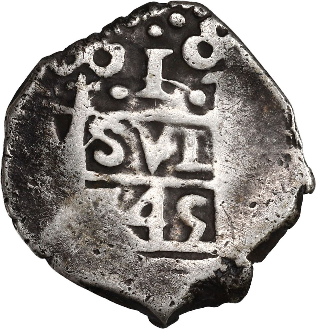 PERU, Lima, cob 1 real, 1745 V, ex-Ugaz. S-L22; KM-31a; Cal-427. 2.89 grams. VF with nice bold date between pillars, partial off-center cross with clear assayer and part of the legend visible, dark gray-toned fields contrasting with lighter high points of the design. Pedigreed to the Jorge Ugaz Collection.