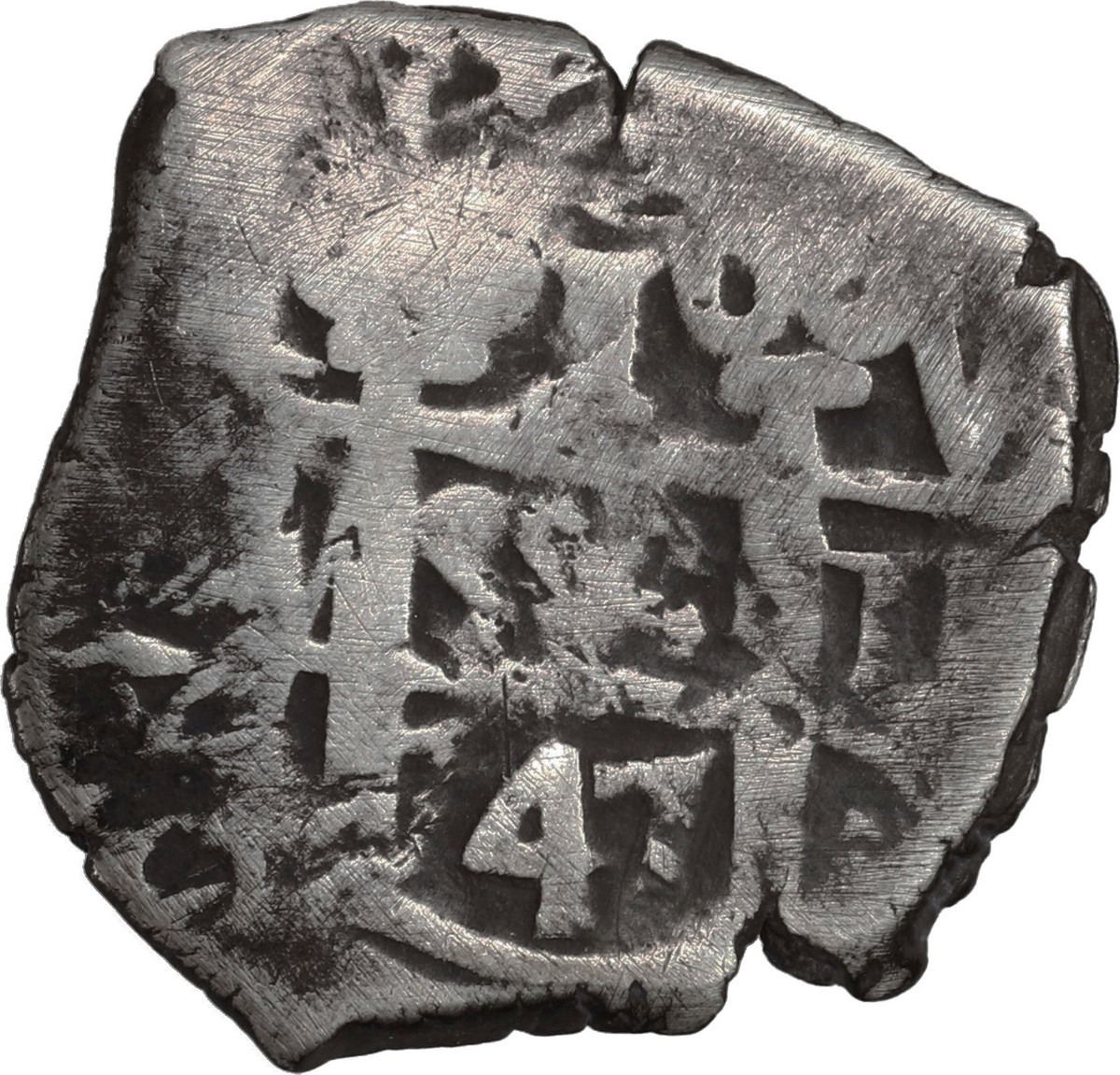 PERU, Lima, cob 1 real, 1747 V, ex-Ugaz. S-L22a; KM-42; Cal-unl (Type 25). 3.34 grams. Fine with two dates, full and centered cross, dark surfaces with some hairlines, Ferdinand VI type by default (but Calicó lists the date under Philip V). Pedigreed to the Jorge Ugaz Collection.