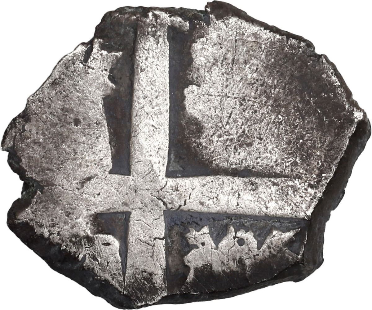PERU, Lima, cob 1 real, 1750 (R), cross side struck from 2R die, rare, ex-Ugaz. S-L23; KM-unl (42 for type); Cal-unl (Type 25). 3.82 grams. VF, struck on a chunky flan with some flat areas though date between pillars is clear, distinctive large cross from a 2 reales die. Pedigreed to the Jorge Ugaz Collection.