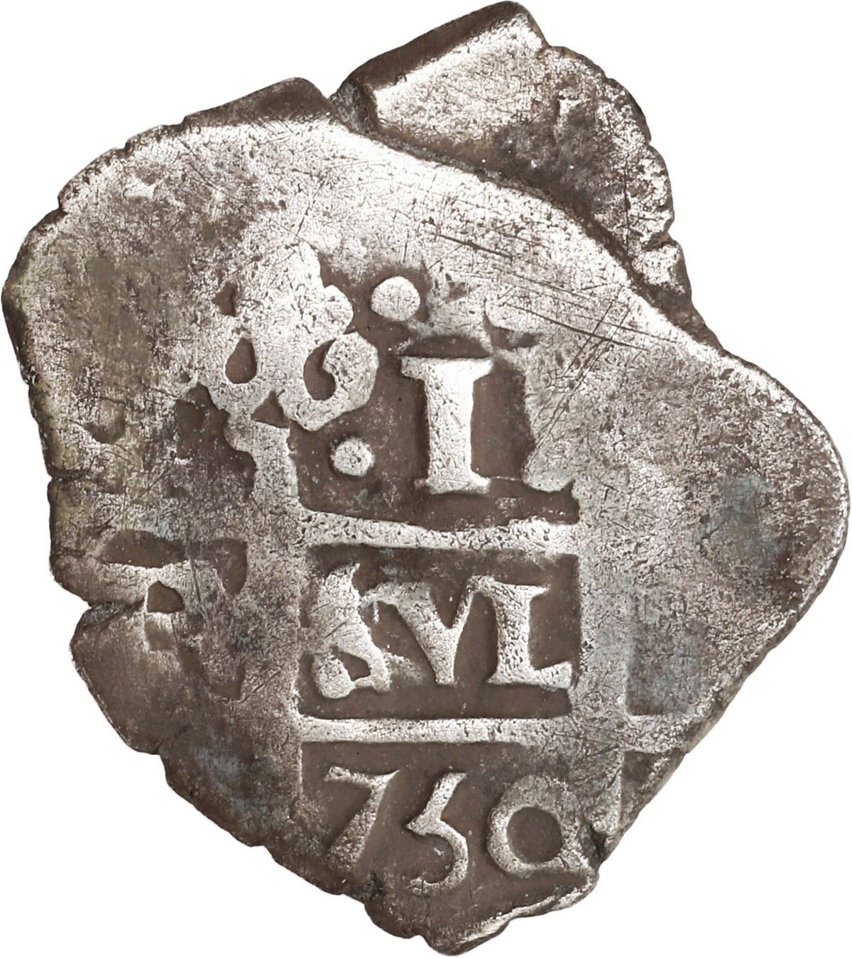 PERU, Lima, cob 1 real, 1750 (R), rare, ex-Ugaz. S-L23; KM-42; Cal-148. 3.23 grams. VF on an interestingly shaped (if crude) planchet, bold date between pillars and partial cross, matte dark gray surfaces with some hairlines. Pedigreed to the Jorge Ugaz Collection.