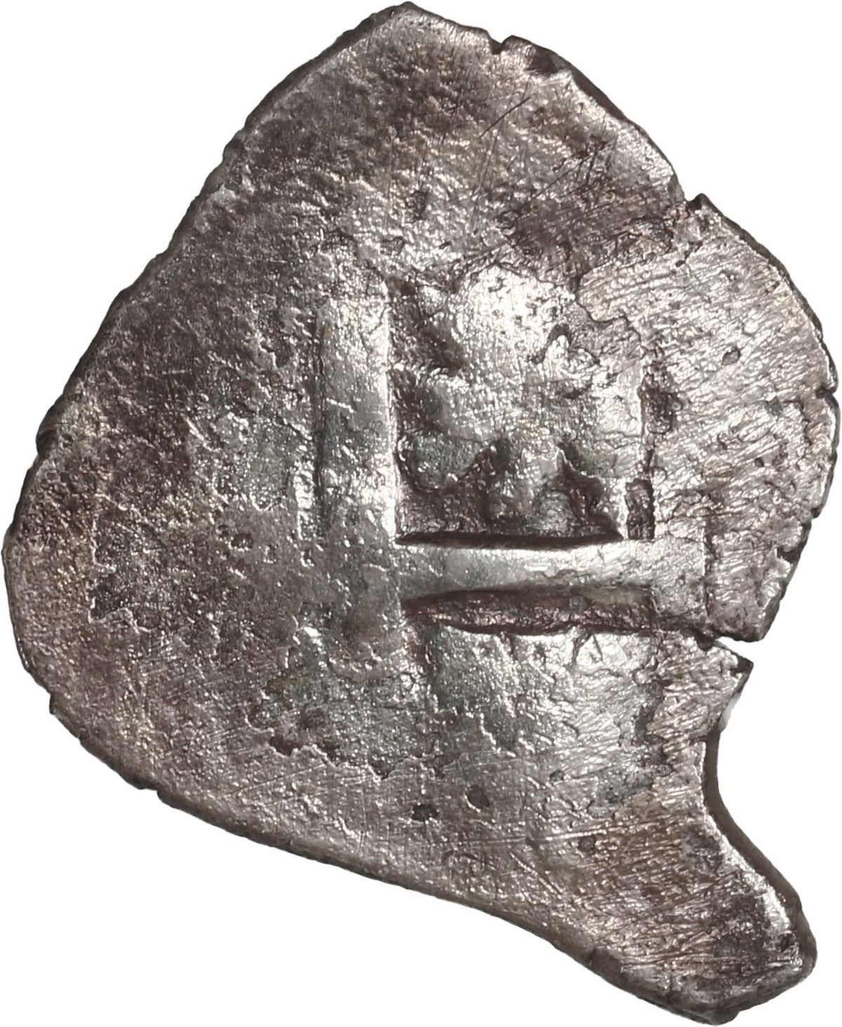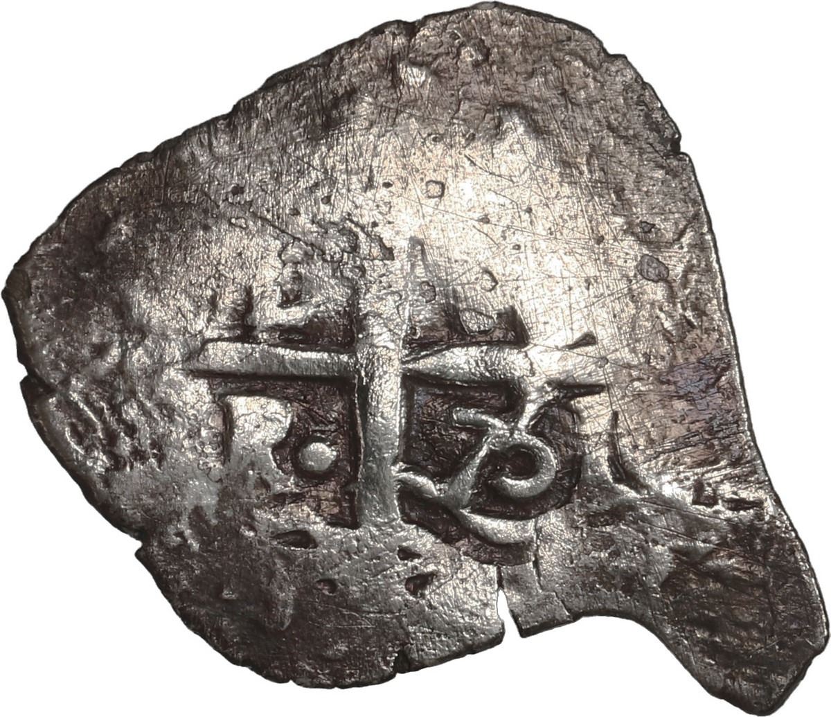 PERU, Lima, cob 1 real, 1751 R, rare, ex-Ugaz. S-L23; KM-42; Cal-149. 2.35 grams. AVF with partial pillars and cross struck on a crude, oddly shaped planchet, clear date and assayer, lightly corroded and cleaned surfaces from probable salvage. Pedigreed to the Jorge Ugaz Collection.