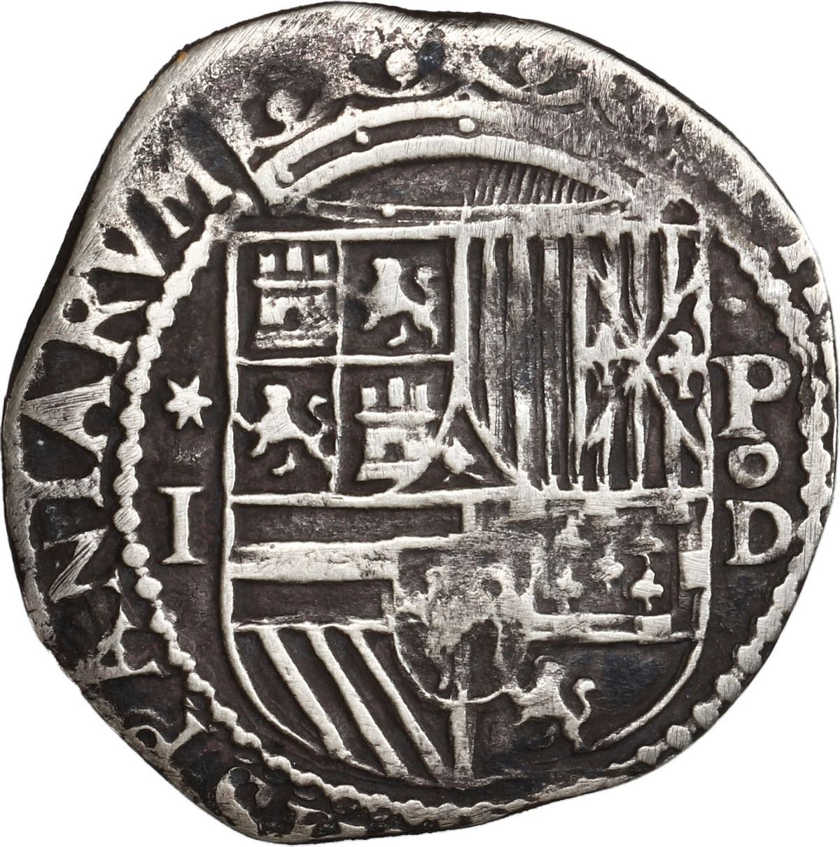 PERU, Lima, cob 1 real, Philip II, assayer Diego de la Torre, *-I to left, P-oD to right, ex-Ugaz. S-L4; KM-7; Cal-212. 3.21 grams. Sharp VF+ details with deep contrast from darkly toned fields, the slightly off-center shield particularly nice but with doubling on upper half of cross. Pedigreed to the Jorge Ugaz Collection.