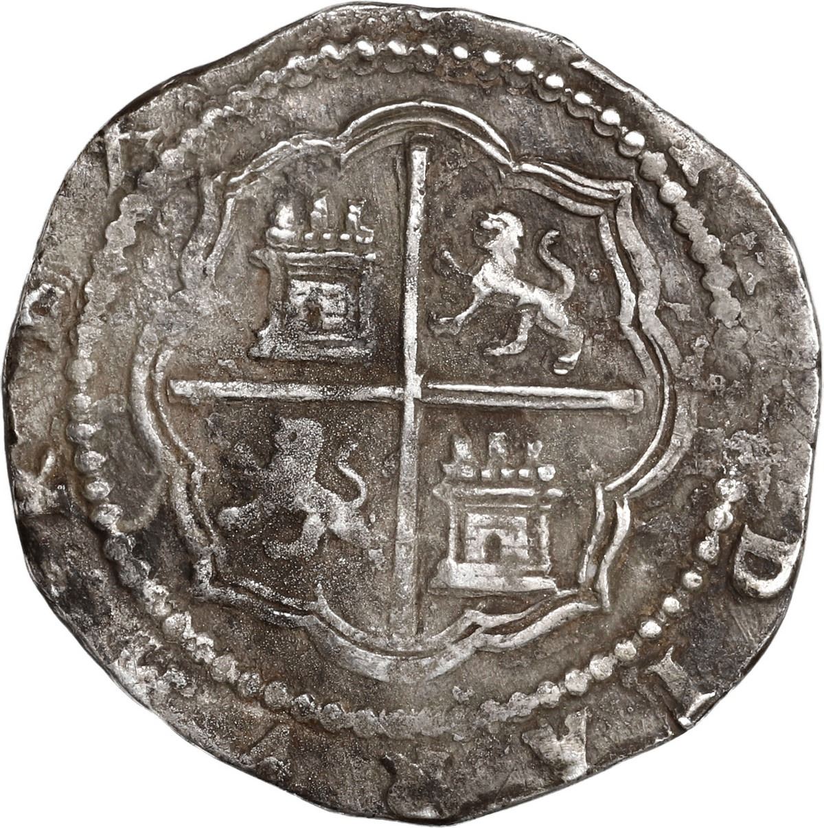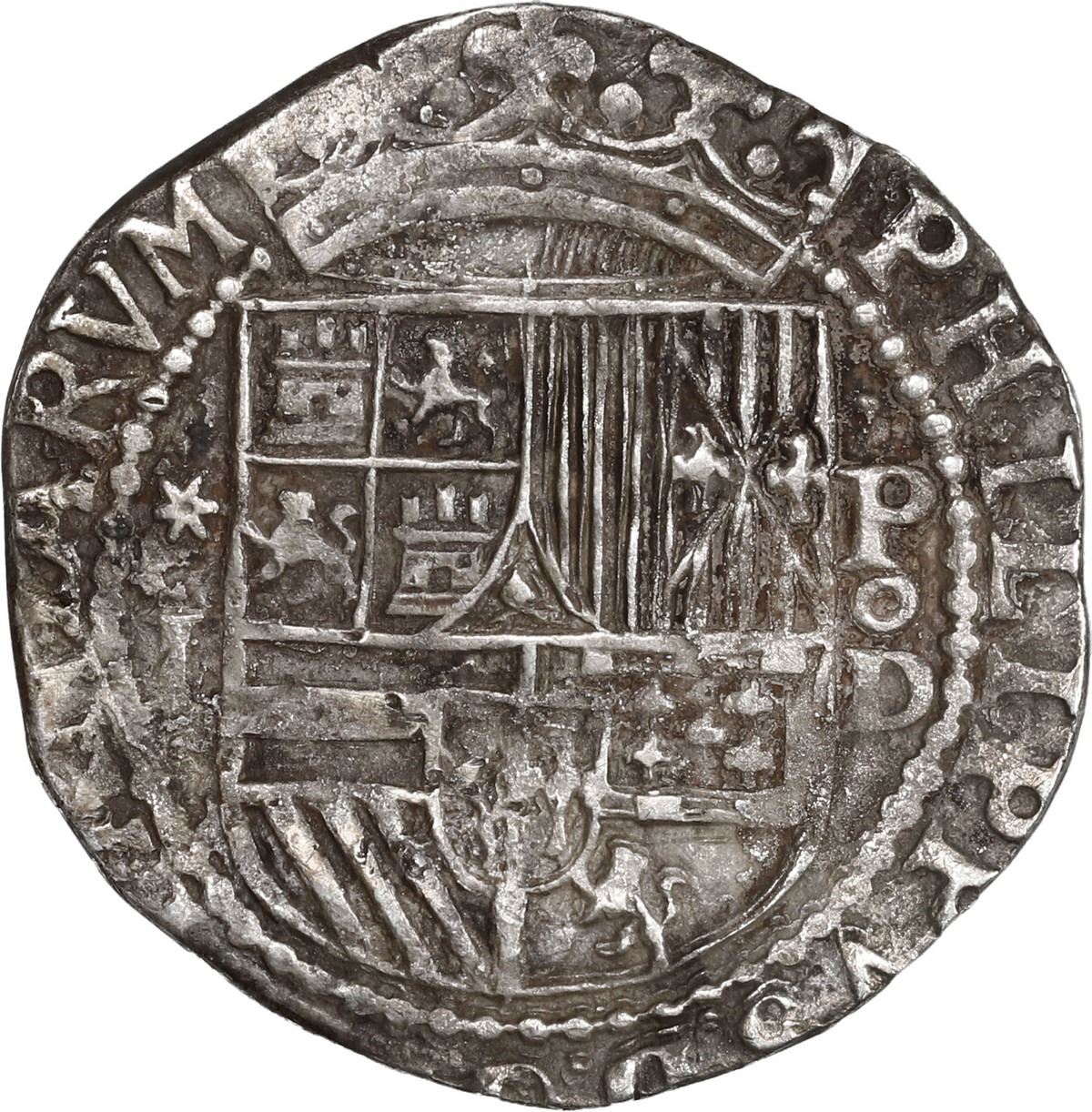 PERU, Lima, cob 1 real, Philip II, assayer Diego de la Torre, *-I to left, P-oD to right, ex-Ugaz. S-L4; KM-7; Cal-212. 3.36 grams. XF+ details with brownish oxidation all over, nearly full crown and legends, well centered. Pedigreed to the Jorge Ugaz Collection.
