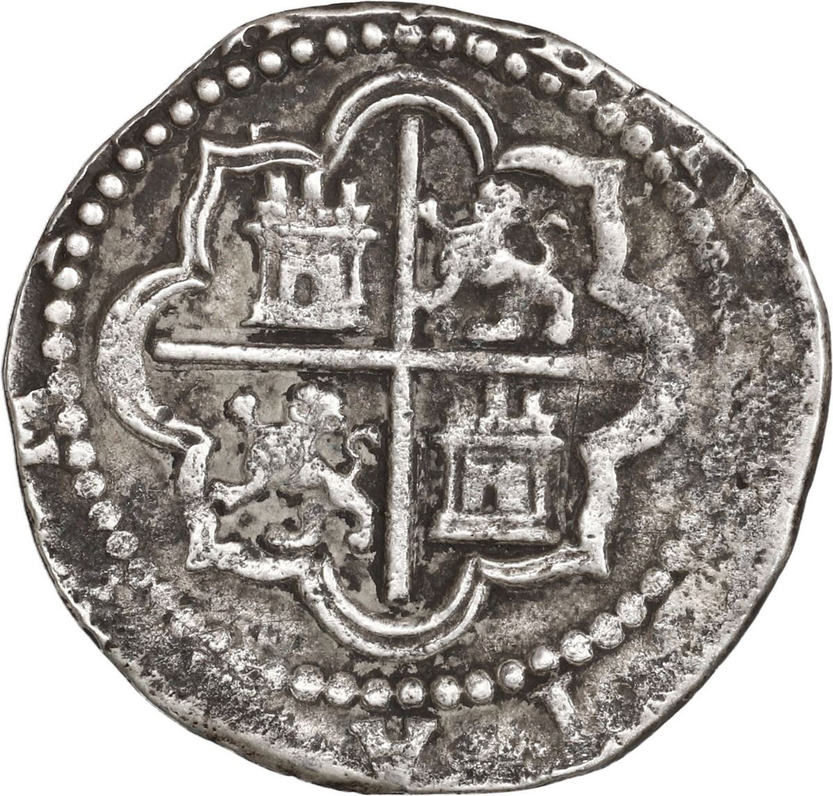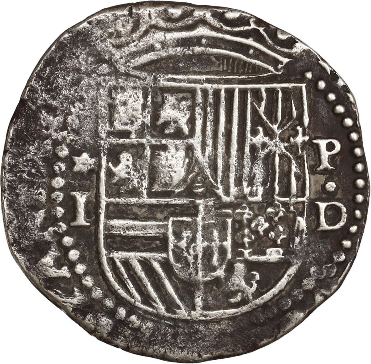 PERU, Lima, cob 1 real, Philip II, assayer Diego de la Torre, *-I to left, P-oD to right, ex-Ugaz. S-L4; KM-7; Cal-212. 3.16 grams. Very sharp XF+ with contrasting toning but somewhat porous from oxidation, the shield and cross particularly well detailed. Pedigreed to the Jorge Ugaz Collection.