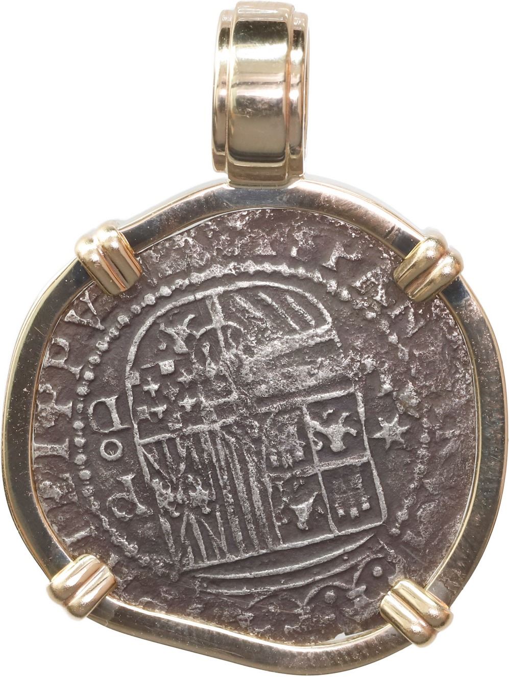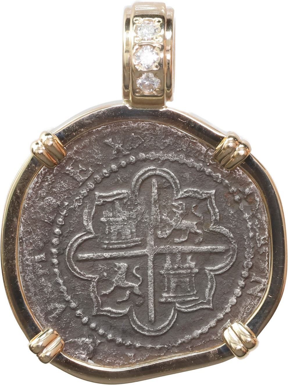 PERU, Lima, cob 1 real, Philip II, assayer Diego de la Torre, *-I to left, P-oD to right, mounted cross-side out in 14K gold pendant with diamonds on fixed bail. 7.14 grams total. XF with nice full cross and tressure, complete shield with clear mintmark and assayer as well as full king's name, dark surfaces with light corrosion.