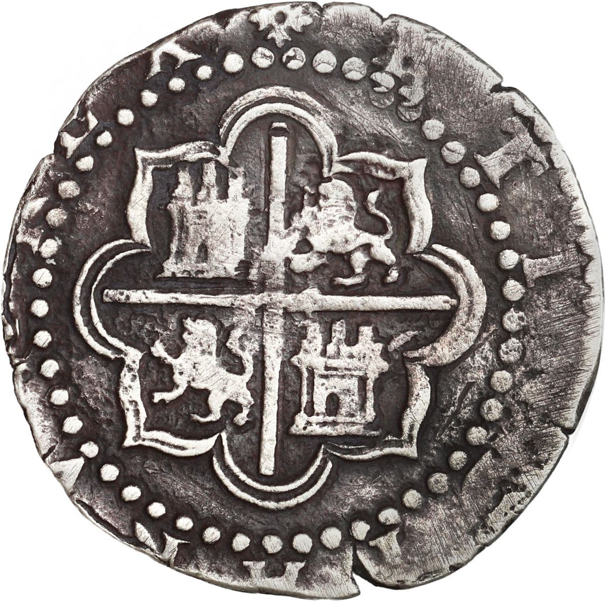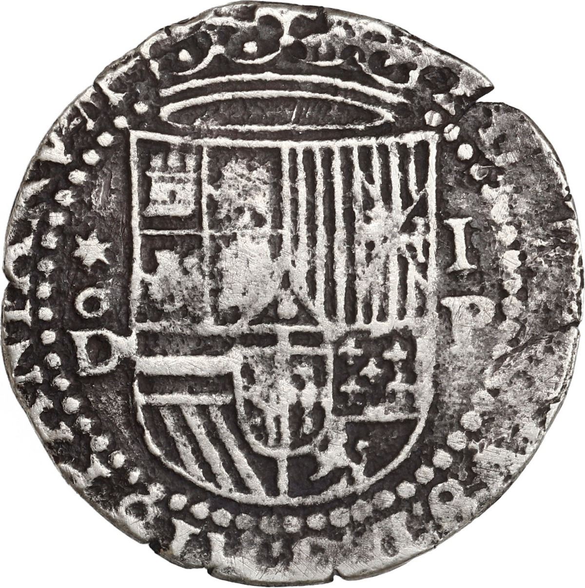 PERU, Lima, cob 1 real, Philip II, assayer Diego de la Torre, *-oD to left, I-P to right, ex-Ugaz. S-L4; KM-7; Cal-213. 2.92 grams. VF with dark toning on fields (good contrast), nearly full crown, sharp details throughout but with traces of surface porosity. Pedigreed to the Jorge Ugaz Collection.