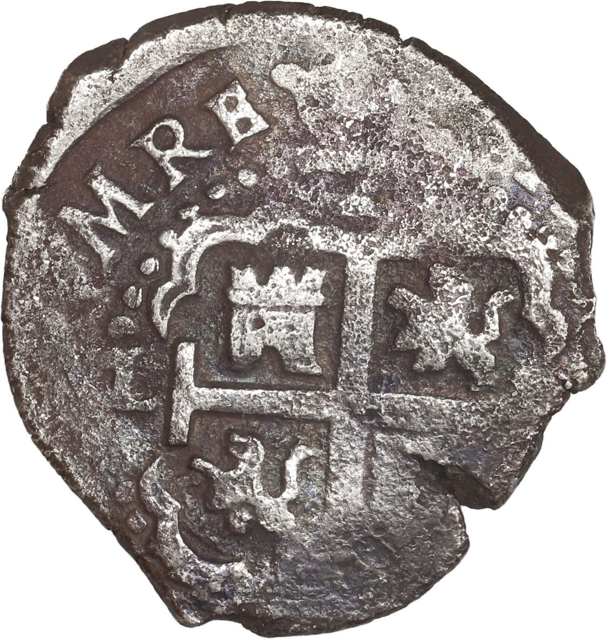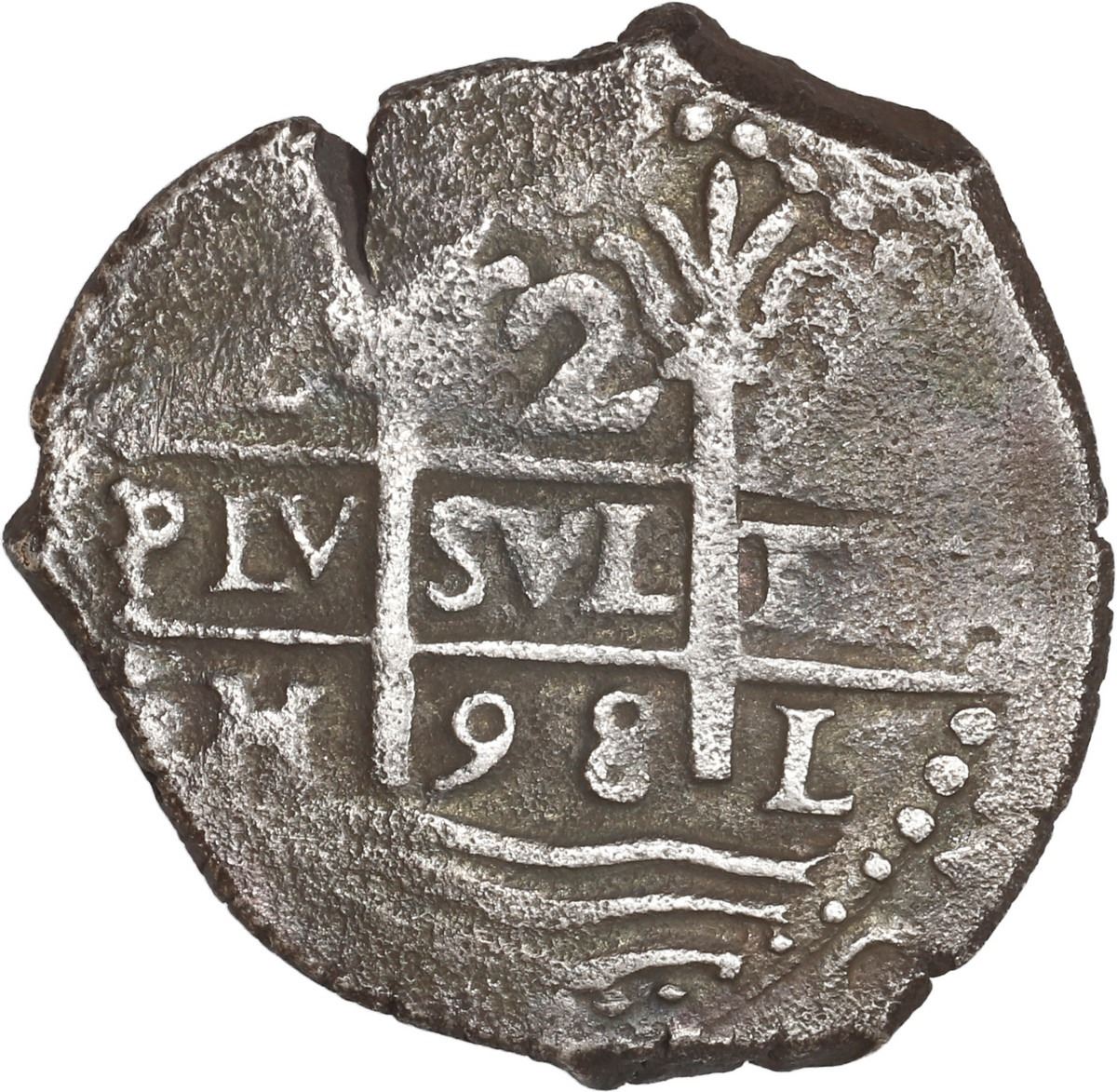 PERU, Lima, cob 2 reales, 1698 H. S-L13; KM-21; Cal-356. 6.76 grams. Full pillars-and-waves, off-center cross, deeply toned XF details with surface porosity, small edge-split.