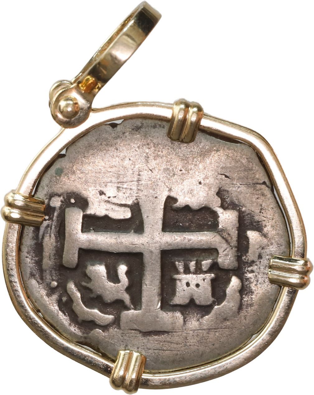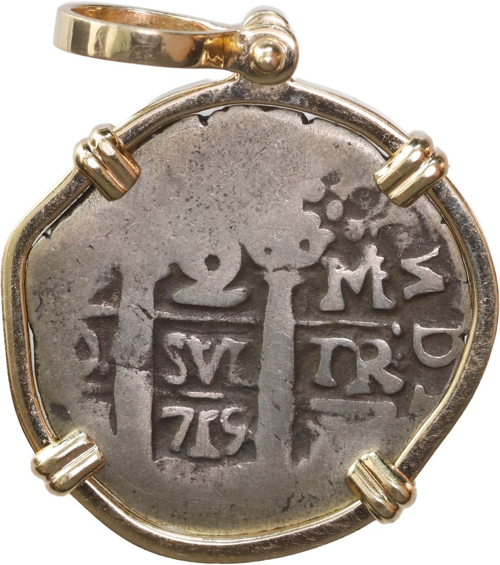PERU, Lima, cob 2 reales, 1715 M, mounted pillars-side out in 14K gold pendant with shackle bail. 8.34 grams total. Fine piece with clear date between nearly complete pillars, retrograde N in legend, partial yet bold cross, dark gray fields contrasting against lighter high points, popular date.