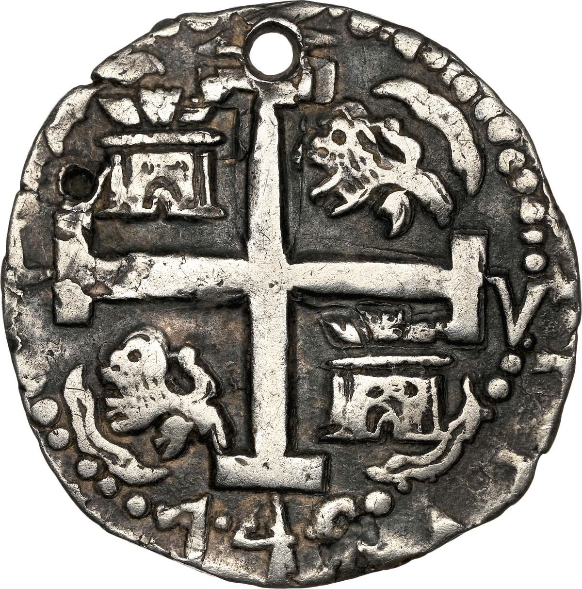 PERU, Lima, cob 2 reales Royal (galano), 1745 V, unique(?), NGC XF details / holed, finest and only example in NGC census. S-L22; KM-unl; Cal-unl (Type 98). 6.54 grams. Choice interior details (full and bold) with just enough peripheral details to show all three dates and mintmarks and assayers, beautifully toned, with hole at top of cross and attempted hole to left of top-left castle, overall a lovely coin and the first of this date we have ever seen or heard of. Pedigreed to the Jorge Ugaz Collection of Lima Silver Cob 2 Reales.
