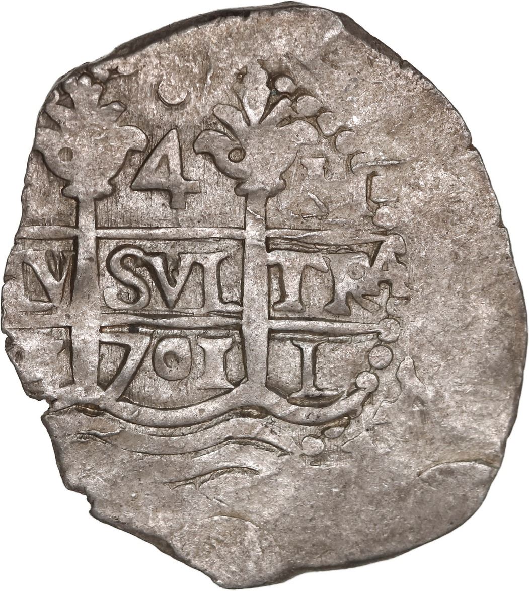 PERU, Lima, cob 4 reales, 1701 H, posthumous Charles II, ex-Ponte. S-L15; KM-unl (23 for type); Cal-476. 12.94 grams. Broad flan with full but off-center pillars-and-waves and cross-lions-castles, two clear dates and assayers and mintmarks, traces of king's name in legend (the peripheries otherwise flat), non-toned XF+. Pedigreed to the Luis R. Ponte Collection.