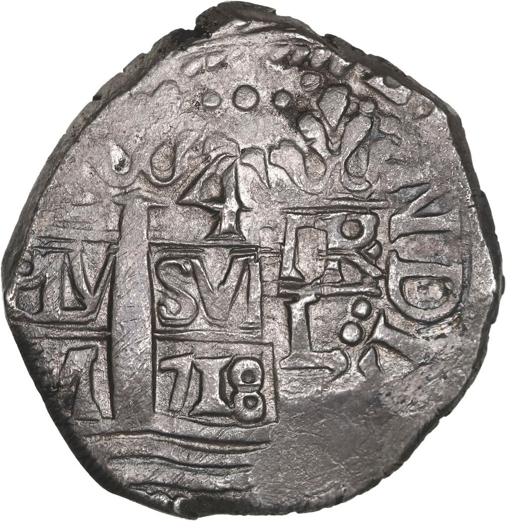 PERU, Lima, cob 4 reales, 1718 M, rare, ex-Ponte. 13.04 grams. Full but off-center cross-lions-castles with much of king's name in legend, full but doubled pillars-and-waves, clear date, two assayers, AU+ details but with very slight surface oxidation, light toning. Pedigreed to the Luis R. Ponte Collection.