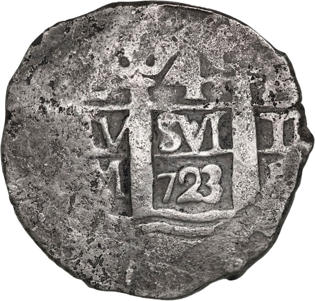 PERU, Lima, cob 4 reales, 1723 M, rare, ex-Ponte. S-L20; KM-33; Cal-1037. 11.33 grams. Round flan with bold full date between pillars, nearly full but off-center cross, flat peripheries and light surface corrosion (probably from the Princess Louisa of 1743), toned in crevices. Pedigreed to the Luis R. Ponte Collection.