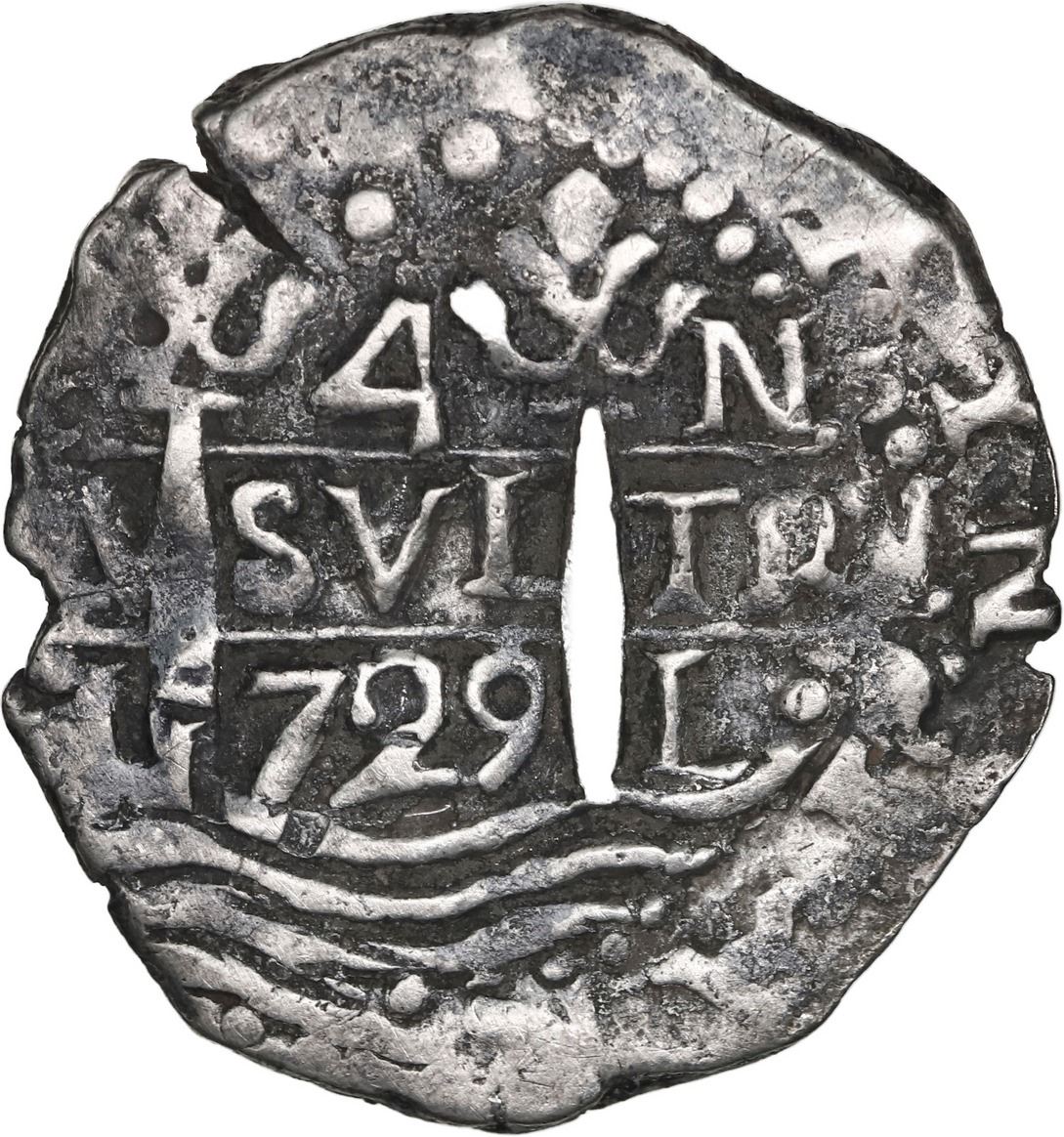 PERU, Lima, cob 4 reales, 1729 N, Royal-like, rare, ex-Ponte. S-L21; KM-33; Cal-1042. 12.87 grams. Very bold and choice (Royal-like) details, as exemplifies this date (for reasons unknown), but this example with some surface oxidation, otherwise AU details with light contrasting toning, edge-split, a die-match with the Pat Johnson specimen (Stack's Bowers auction of November 2022, lot 72047) that hammered for $5000. Pedigreed to the Luis R. Ponte Collection.