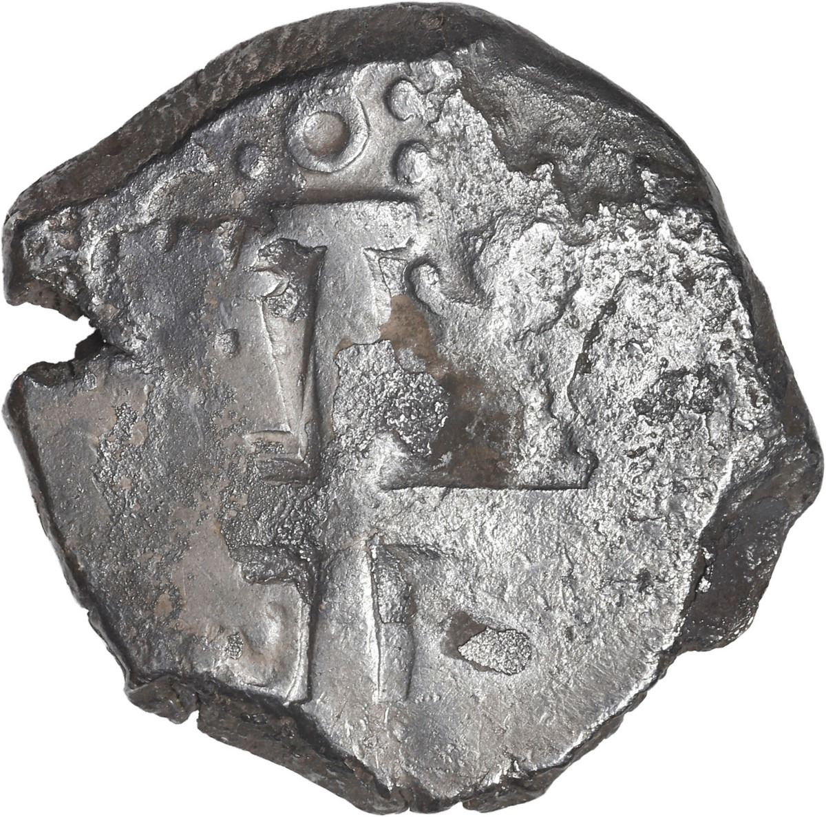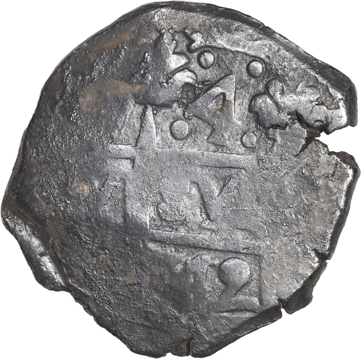 PERU, Lima, cob 4 reales, 1749 (R), cross side struck from 8R die, dots flanking denomination, very rare. S-L23; KM-unl (43 for type); Cal-unl (Type 49). 12.86 grams. Very dark Fine with "horn silver" on surfaces, small edge-crack, but with clear date and denomination .4. below two dots on pillars side, clear denomination :8: above cross, first we have seen with visible date (same dies as lot 1900 in this auction).