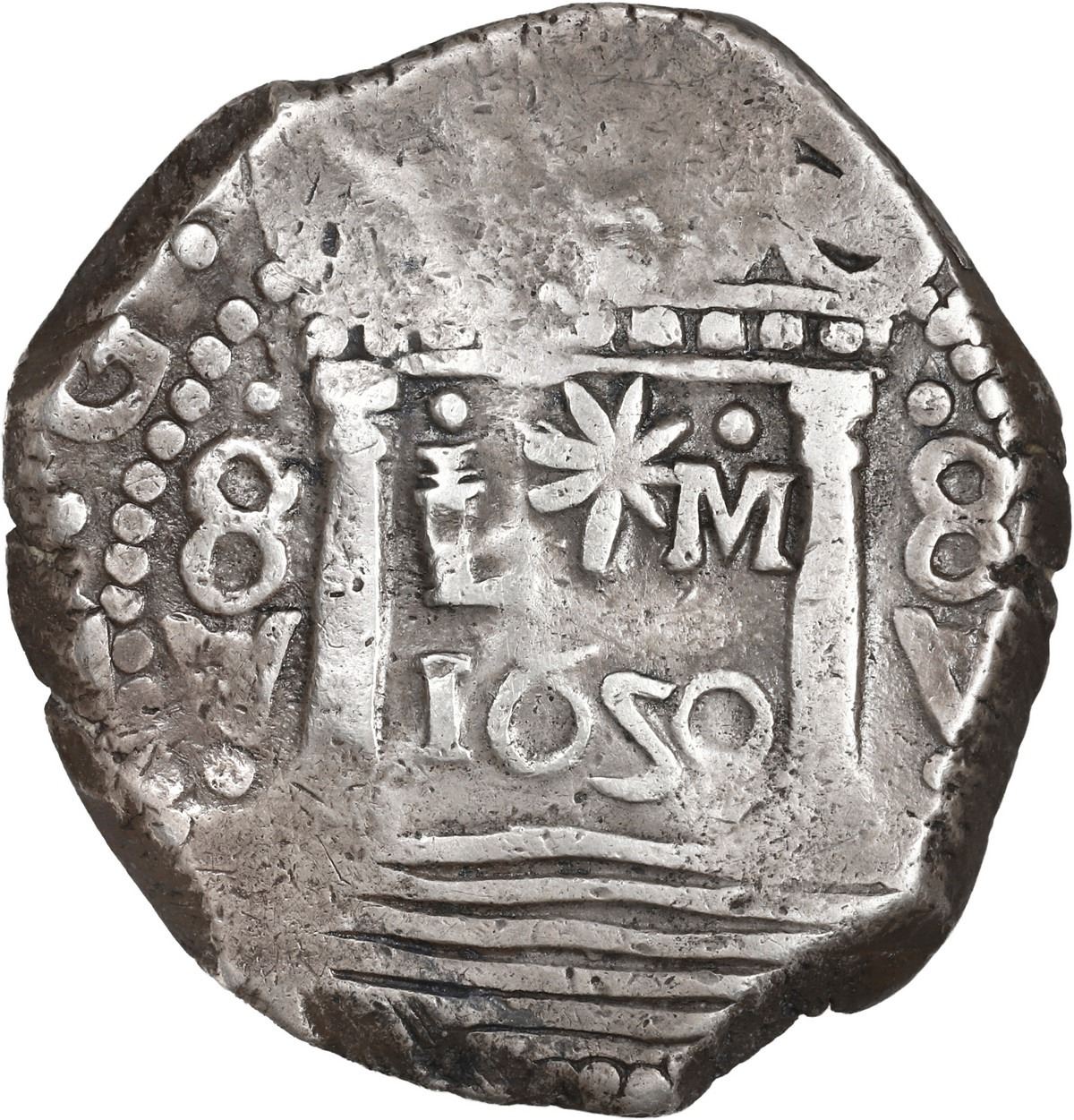 PERU, Lima, cob 8 reales, 1659 V, mintmark L?M, •8•V to left and right, rare, ex-Ugaz, ex-Rosenheim. Sedwick-II.8.5; S-L5; KM-18.1; Cal-1247. 27.33 grams. Thick and chunky flan (small diameter) with bold full pillars-and-waves showing clear •8-V• to left and right and L?M (with dots above the L and M) above 1659 date in center, choice full cross-lions-castles, much better strike than usual but with legends off the flan, attractively toned VF+ and certainly one of the best examples we have seen of this variety. Pedigreed to the Jorge Ugaz Collection and the Arturo Rosenheim collection, also to the Baldwin's auction of September 2010 (lot 3959).