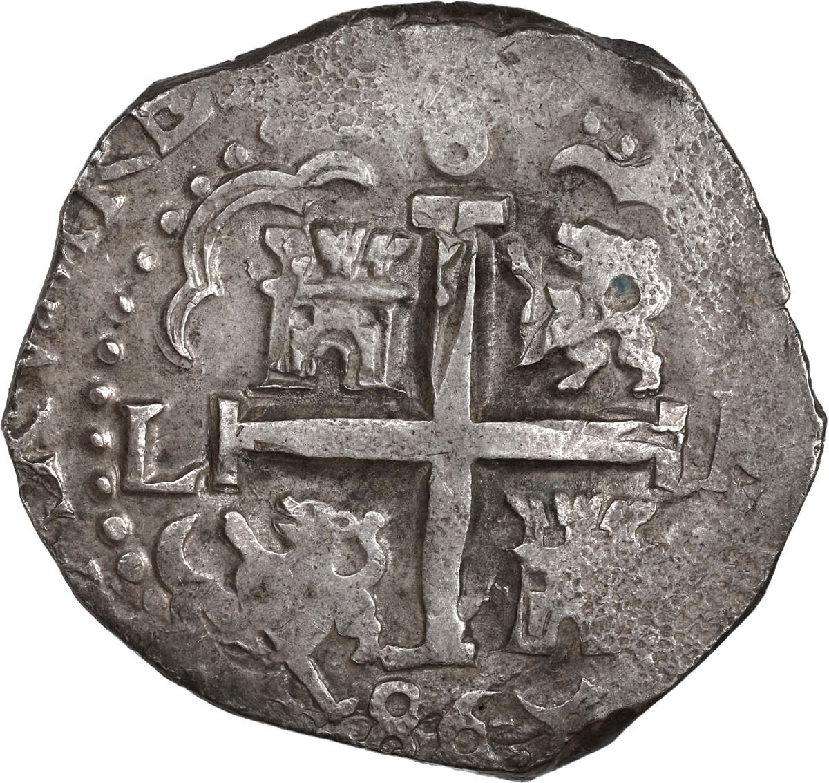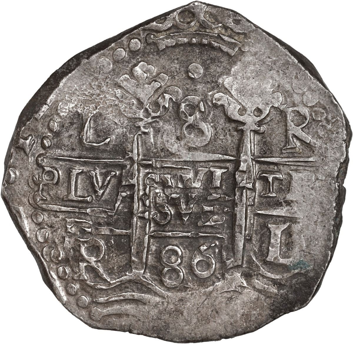 PERU, Lima, cob 8 reales, 1686 R, single dot at top, ex-Ugaz. S-L7; KM-24; Cal-591. 27.28 grams. Bold full cross, well-centered full pillars (slightly doubled), two dates, three mintmarks and assayers, nicely toned AU-. Pedigreed to the Jorge Ugaz Collection.