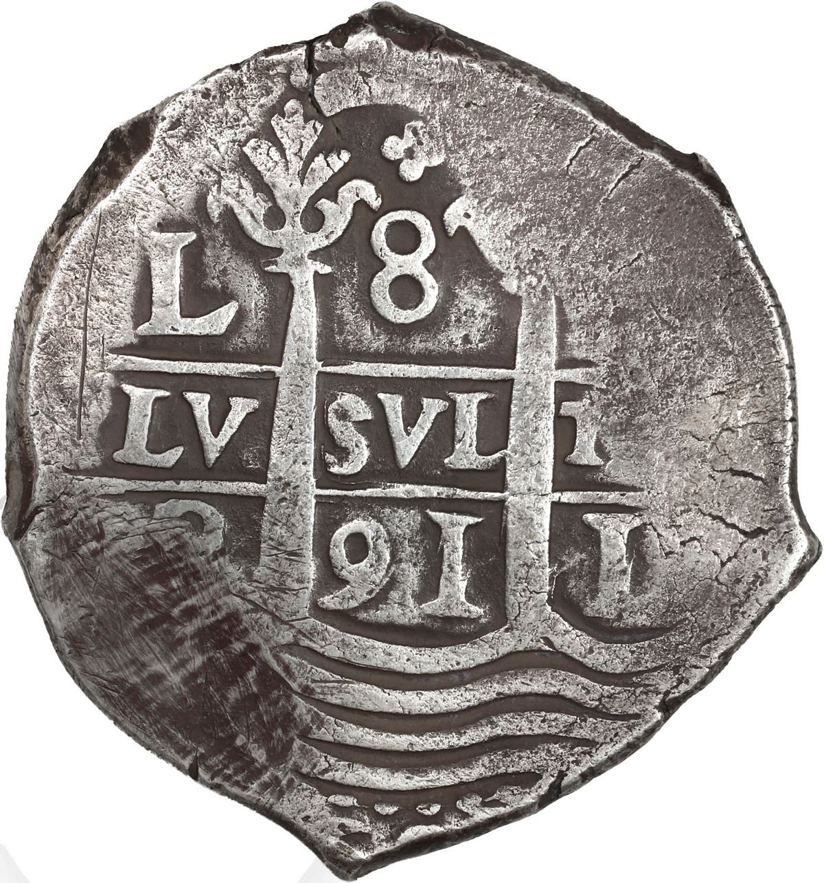 PERU, Lima, cob 8 reales, 1691 R, quatrefoil at top, ex-Ugaz. S-L9; KM-24; Cal-596. 27.19 grams. Well-centered full pillars-and-waves, nearly full cross-lions-castles, two bold dates, contrastingly toned VF+ with some peripheral tooling. Pedigreed to the Jorge Ugaz Collection.