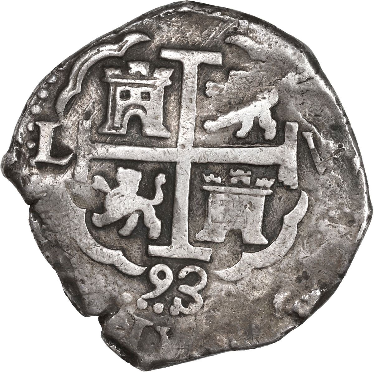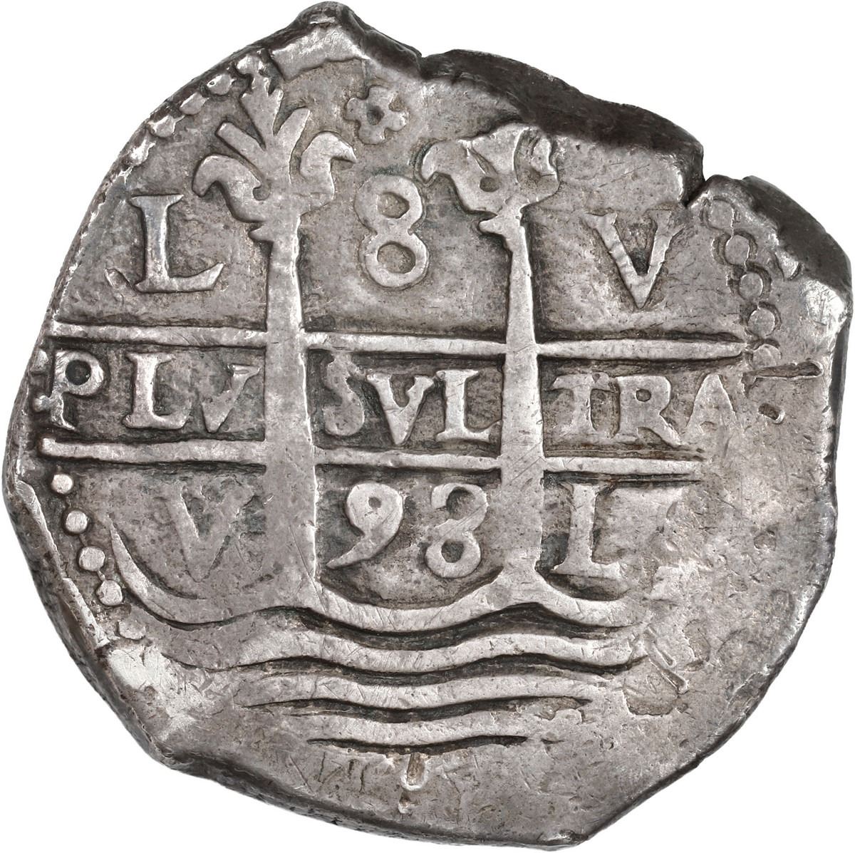 PERU, Lima, cob 8 reales, 1693 V, quatrefoil at top, rare variety, ex-Ugaz. S-L10; KM-24; Cal-598. 26.13 grams. Excellent full cross-lions-castles with very bold date above king's ordinal II in legend, full pillars-and-waves with strong second date, all three mintmarks and assayers visible, richly toned AXF with traces of sediment in crevices, full and clear quatrefoil at top as opposed to single dot as is seen on nearly all other examples. Pedigreed to the Jorge Ugaz Collection and Cayón Auction 278 July 218.