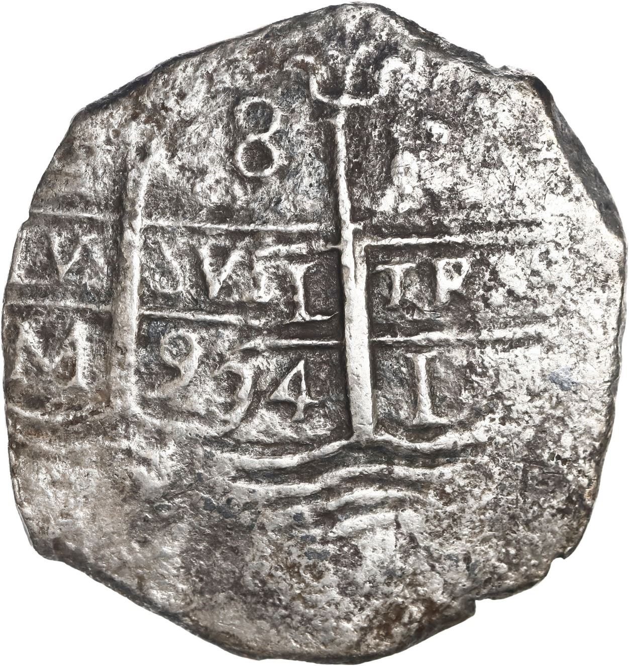 PERU, Lima, cob 8 reales, 1694 M, ex-Mastalir. S-L11; KM-24; Cal-599. 21.08 grams. Full pillars-and-waves with doubling in center, making the date look like "994," bold second date below most of cross, two bold mintmarks and one clear assayer, thin from corrosion, patchy toning, very rare as from a wreck just off Mar Bravo beach that long had been kept secret by locals, who avoided confiscation by melting down the coins, the silver ones becoming spoons and the gold ones (some of which were Cuzco 2 escudos!) into fake teeth. Pedigreed to the Roberto Mastalir Collection (Sedwick Auction 8, with original lot-tag 796 and photo-certificate) and to Sedwick Auction 14, with original lot-tag 474. Recovered from: Aguila Volante, sunk in 1701 off Punta Santa Elena, Ecuador