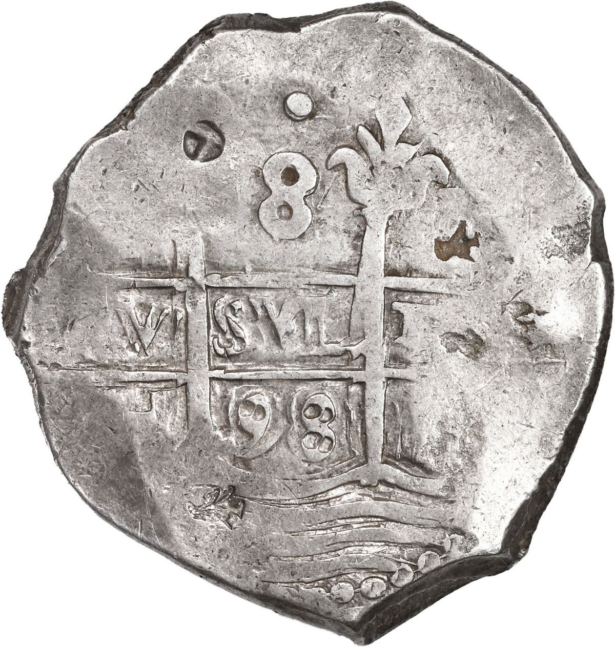 PERU, Lima, cob 8 reales, 1698 H, single dot at top, with chopmarks from circulation in Asia, ex-Ugaz. S-L13; KM-24; Cal-605. 27.09 grams. XF with full pillars-and-waves and cross-lions-castles despite peripheral flatness, nearly a dozen small chopmarks (somewhat rare on this type) clearly visible on both sides. Pedigreed to the Jorge Ugaz Collection.