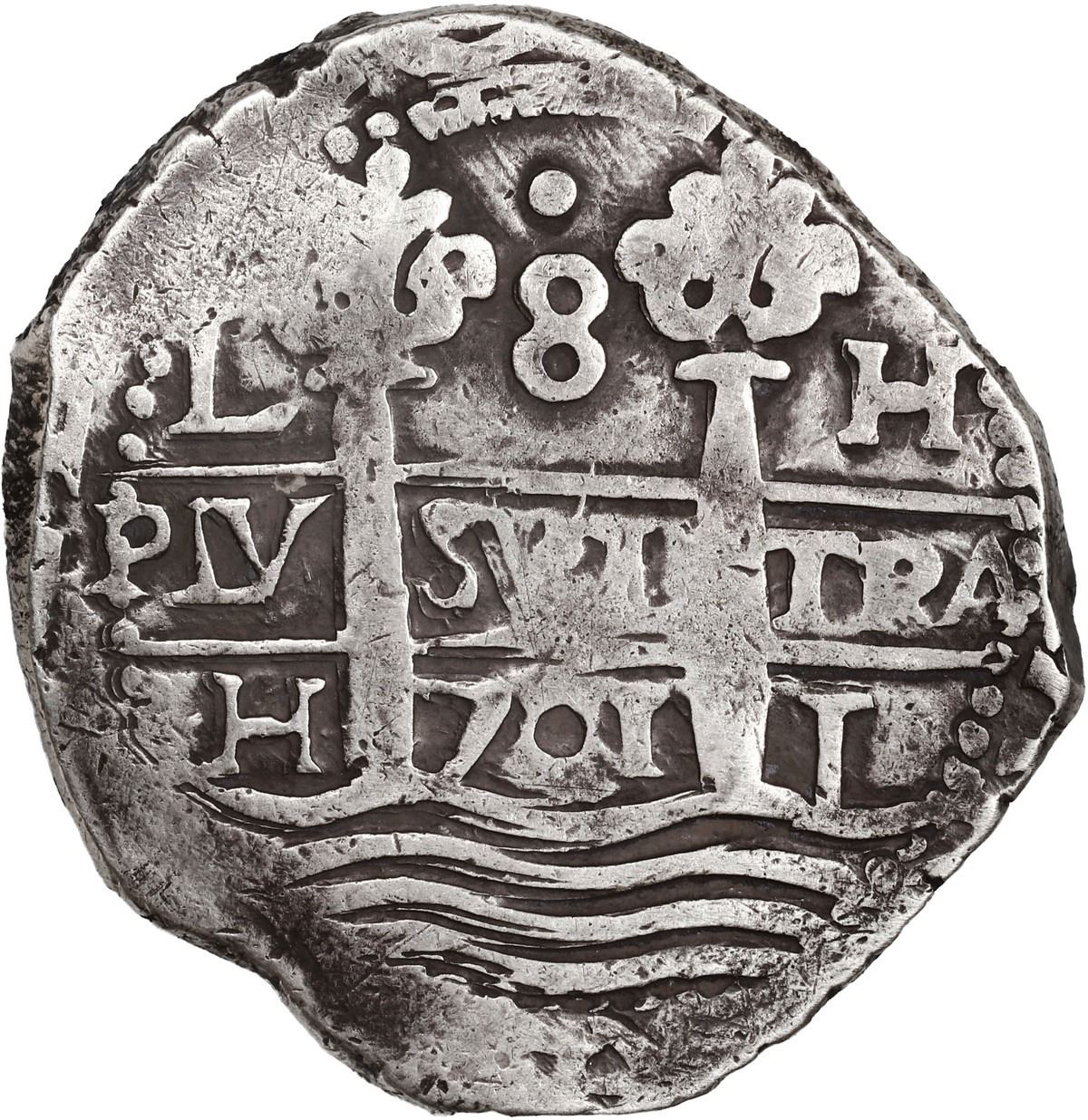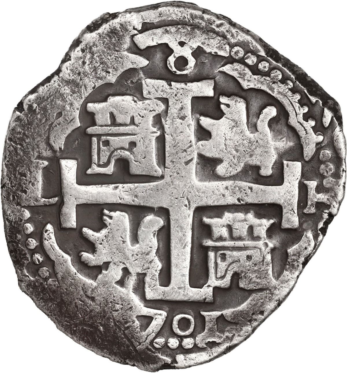 PERU, Lima, cob 8 reales, 1701 H, single dot at top, posthumous Charles II, ex-Ugaz. S-L15; KM-24; Cal-608. 27.00 grams. Well-centered strike with choice full cross-lions-castles showing clear date, assayer, denomination, and mintmark plus the bottoms of some letters of king's name in legend, also full pillars-and-waves with two mintmarks and assayers on that side in addition to a second date that was expertly re-engraved to show the middle digit (formerly flat), nicely toned AVF. Pedigreed to the Jorge Ugaz Collection.
