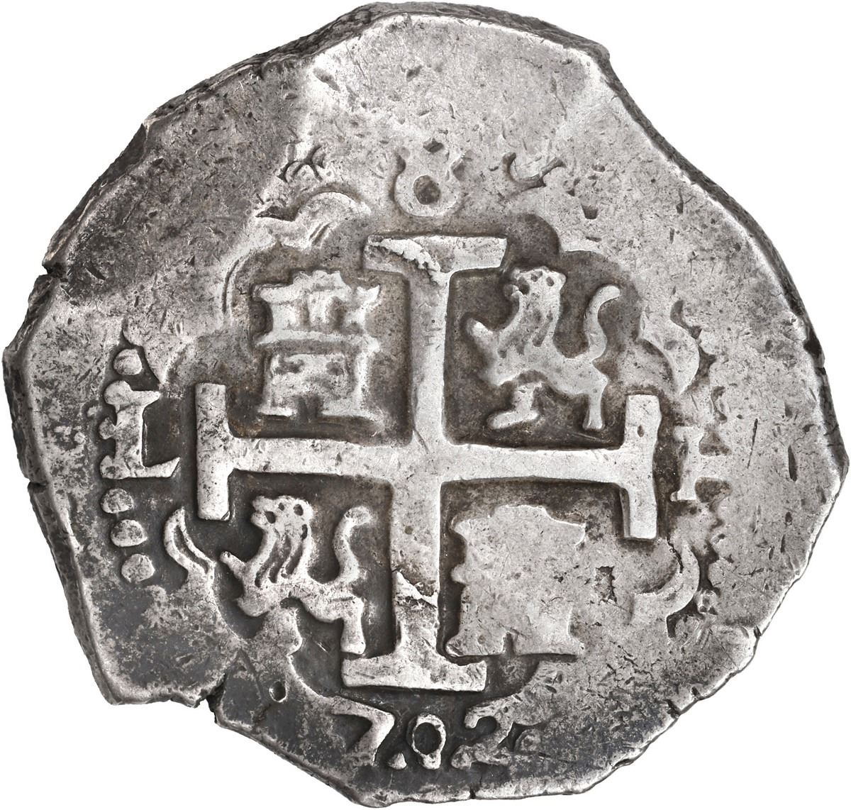 PERU, Lima, cob 8 reales, 1702 H, single dot at top, ex-Ugaz. S-L15a; KM-34; Cal-1273. 27.27 grams. Excellent full pillars-and-waves and cross-lions-castles (both well centered), with two dates and all three mintmarks and assayers visible, deeply toned VF. Pedigreed to the Jorge Ugaz Collection and Áureo & Calicó Auction 342 December 2019.