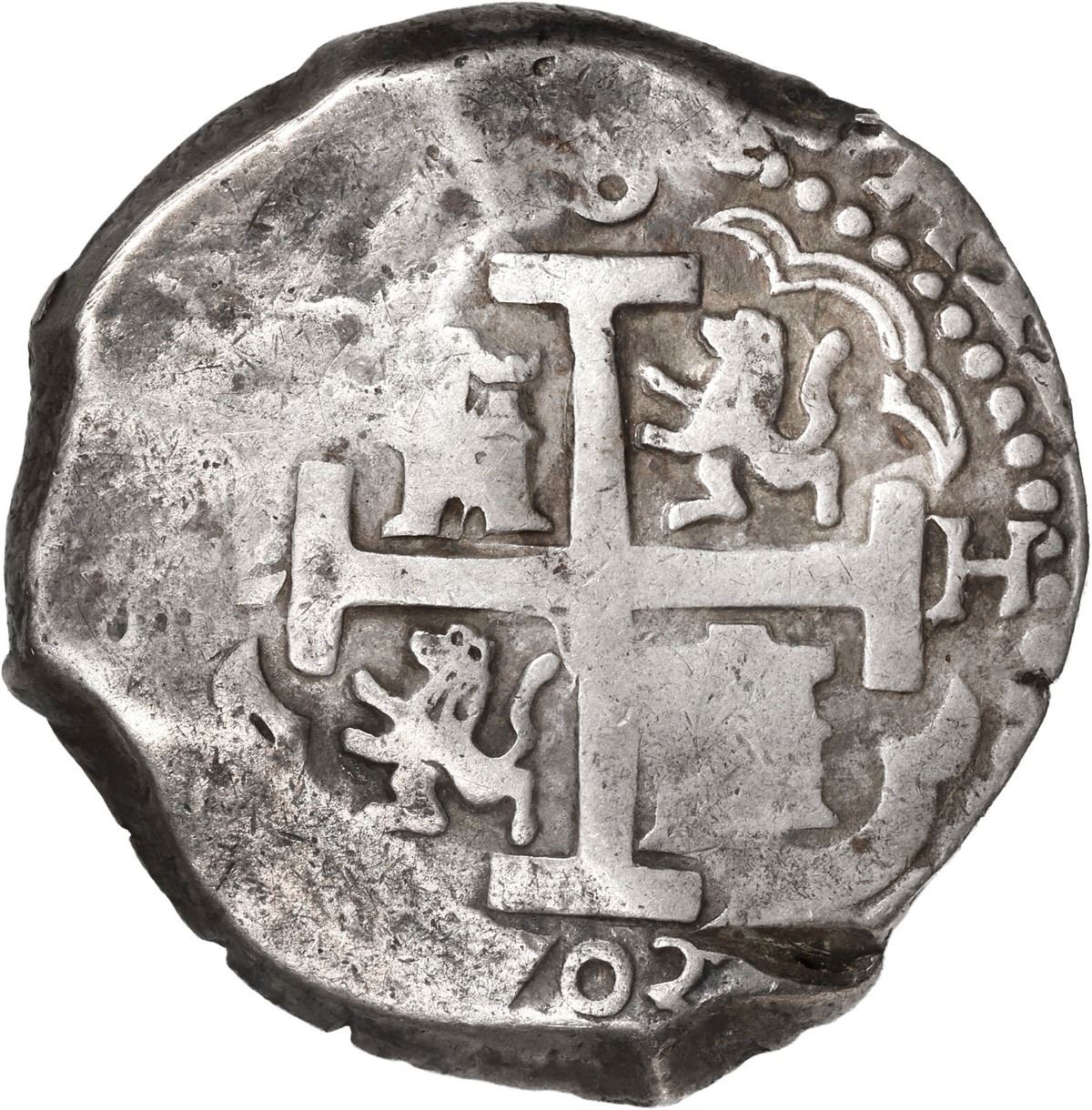 PERU, Lima, cob 8 reales, 1703 H, single dot at top, ex-Ugaz. S-L15a; KM-34; Cal-1275. 26.87 grams. Good full cross, off-center pillars (right-hand pillar complete), two clear dates and assayers, lightly toned AVF. Pedigreed to the Jorge Ugaz Collection.