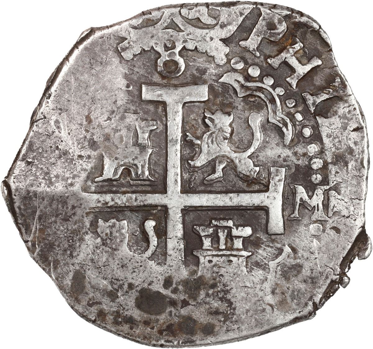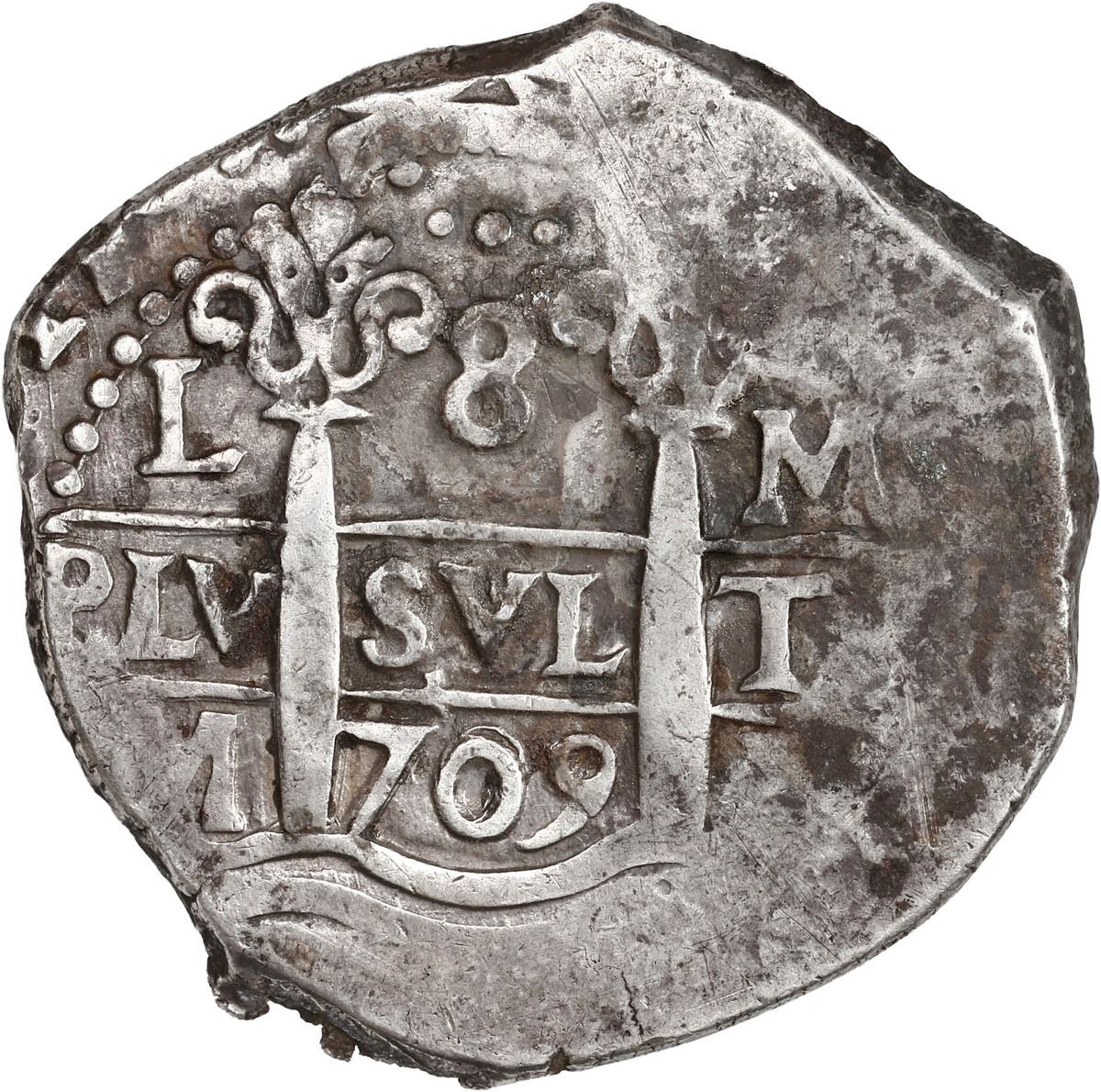 PERU, Lima, cob 8 reales, 1709 M, row of three dots at top, rare, ex-Ugaz.