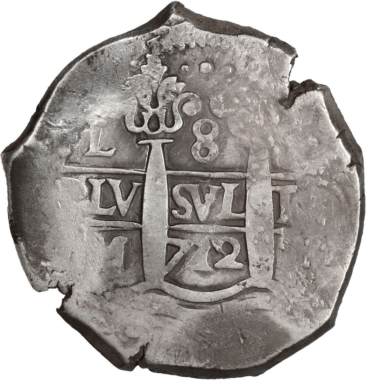 PERU, Lima, cob 8 reales, 1712 M, row of three dots at top, ex-Ugaz. S-L20; KM-34; Cal-1285. 26.93 grams. Well-centered full pillars and cross within flat peripheries, two dates, small edge-splits, lightly toned VF, apparently a very scarce date (first example we have offered at auction). Pedigreed to the Jorge Ugaz Collection.