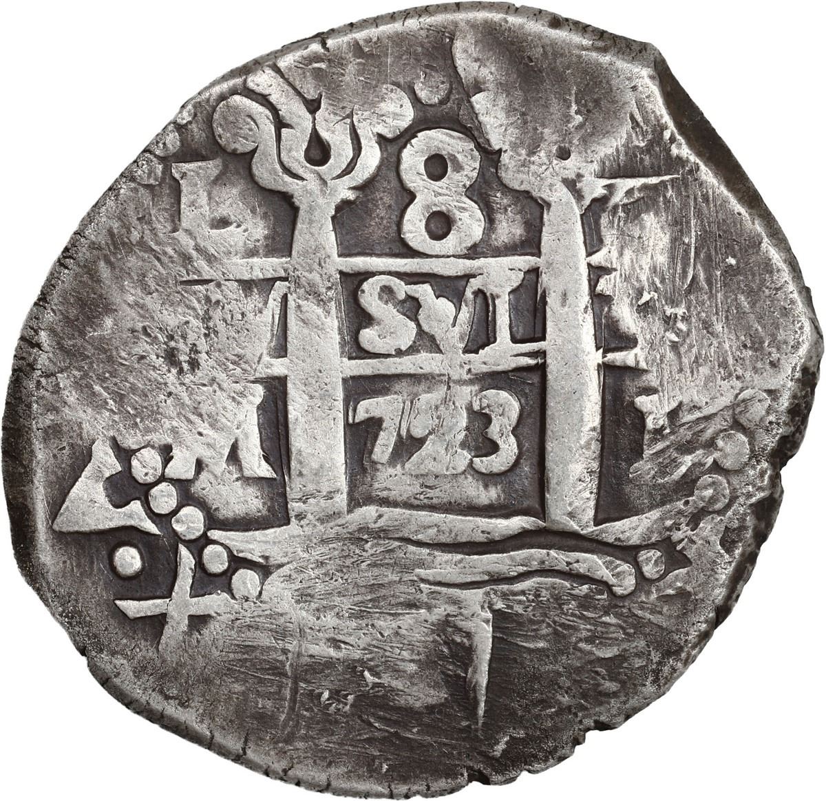PERU, Lima, cob 8 reales, 1723 M, ex-Ugaz. S-L20; KM-34; Cal-1297. 26.69 grams. Full pillars-and-waves, nearly full cross (well centered), two dates, contrastingly toned Fine. Pedigreed to the Jorge Ugaz Collection.