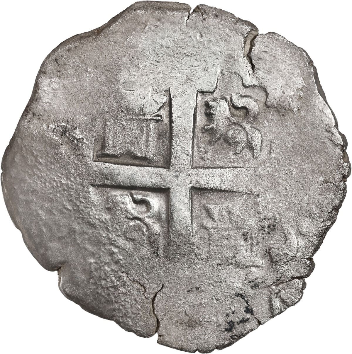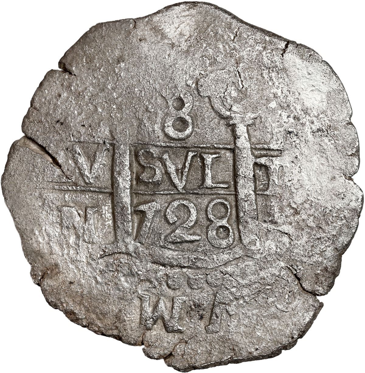 PERU, Lima, cob 8 reales, 1728 N, ex-Ugaz, ex-Rutherford. S-L21; KM-34a; Cal-1301. 24.96 grams. Broad flan, well-centered cross and pillars but peripheries flat and lightly corroded all over (probably from the Princess Louisa of 1743), a couple edge-splits, no toning. Pedigreed to the Jorge Ugaz Collection and the S.P. Rutherford Collection (Stack's Bowers auction of October 2024, lot 73684), also to Sedwick Auction 8 (lot 1212).