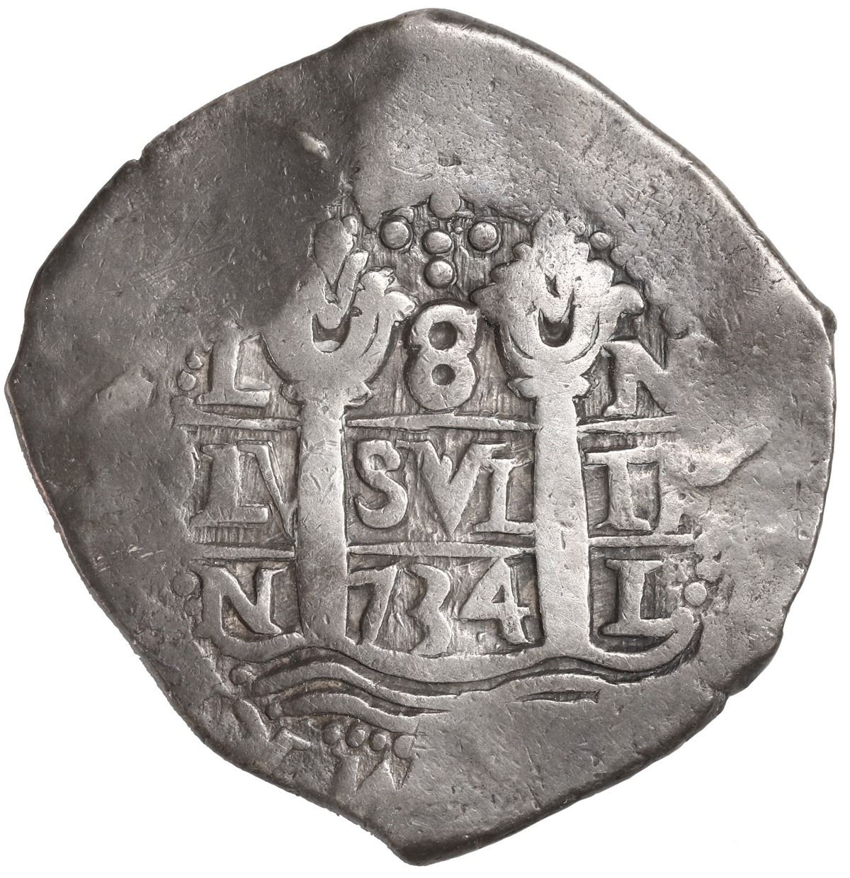 PERU, Lima, cob 8 reales, 1734 N, cross-of-five-dots at top, ex-Ugaz, Calbetó Plate.