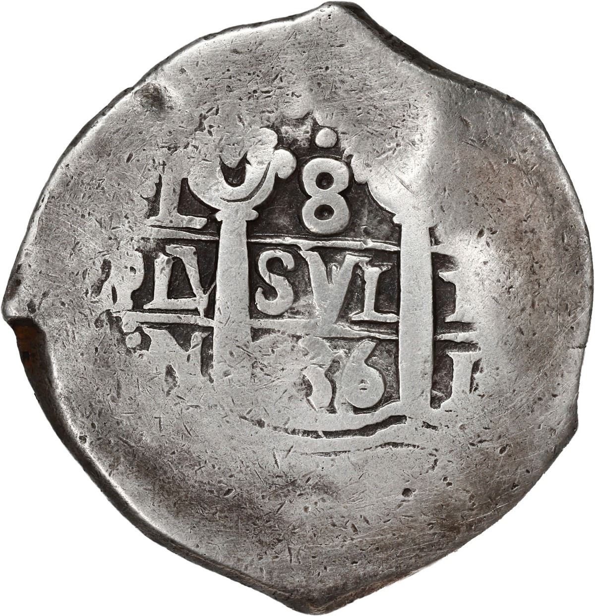 PERU, Lima, cob 8 reales, 1736 N, re-punched 36 in date, cross-of-five-dots at top, ex-Ugaz. S-L21; KM-34a; Cal-1311. 27.10 grams. Well-centered pillars and cross within flat peripheries, AVF with contrasting toning, scarce date (apparently the first example we have offered at auction), decidedly not 1736/5 (which is known) but with clearly re-cut date. Pedigreed to the Jorge Ugaz Collection and the Almanzar auction of May 1977 (lot 1332).